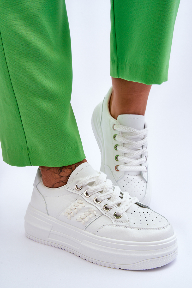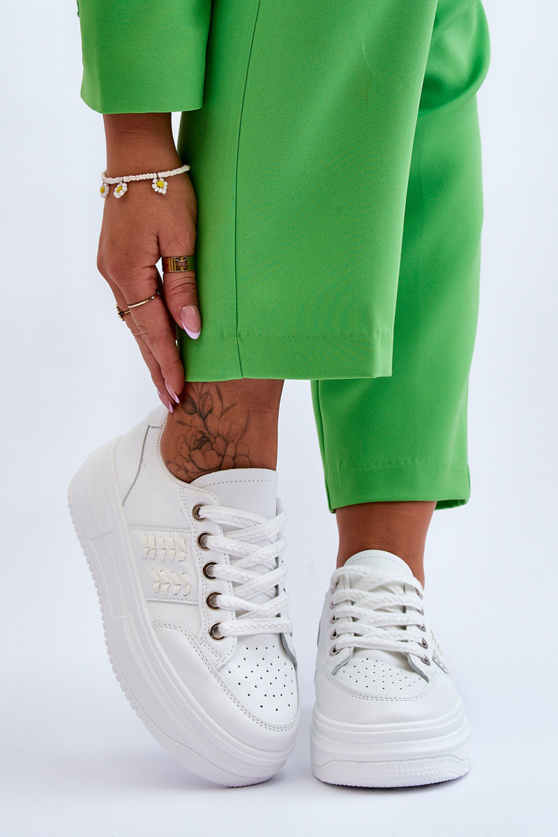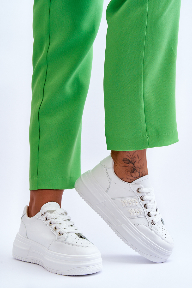 Perfektné topánky každý deň! Klasické, ženské ekologické tenisky s ďalšou perforáciou na prednej strane. Na strane zvršku boli dodatočne zdobené. Športové topánky majú klasické puto s dekoratívnymi šnúrkami. Tento model bol zabudovaný na masívnu plošinu vyrobenú z gumového plastu. Vložka do týchto topánok je odstránená a vyrobená z materiálu. Pri výbere veľkosti nasmerujte tabuľku veľkosti.