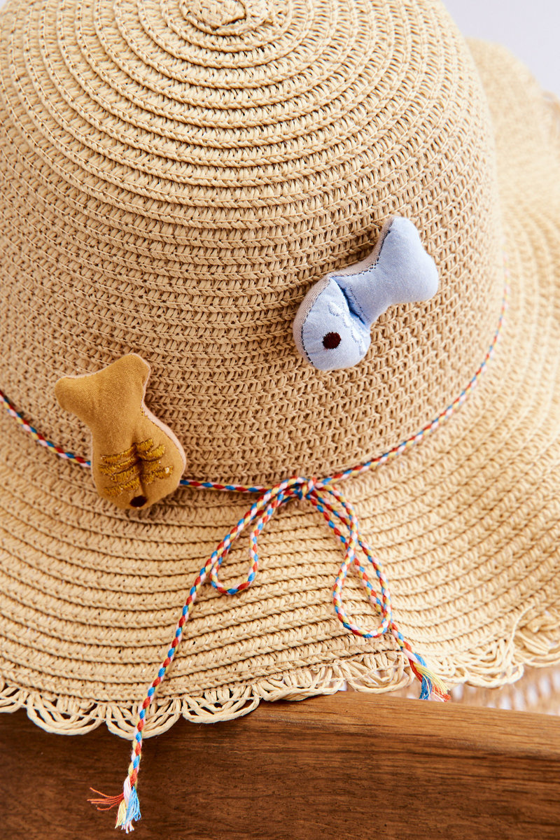 Detský klobúk bude skvelý v horúcich dňoch. Produkt je vyrobený zo 100% papiera. Kruhový kruh je zvlnený. Okrem toho je koruna klobúka zdobená rybami a na stuhe zviazaná tenká šnúra. Vo vnútri je reťazec, ktorý vám umožňuje porovnávať klobúk.
