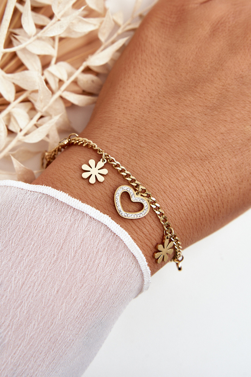 Náramok bol vyrobený z nehrdzavejúcej ocele. Má schopnosť upravovať dĺžku a niekoľko príveskov vo forme kvetov a sŕdc s kamienkami napodobňujúcimi kamienky. Náramok vyzerá mimoriadne zvláštne. Skontrolujte tiež našu zostávajúcu ponuku šperkov. Musíte to mať!