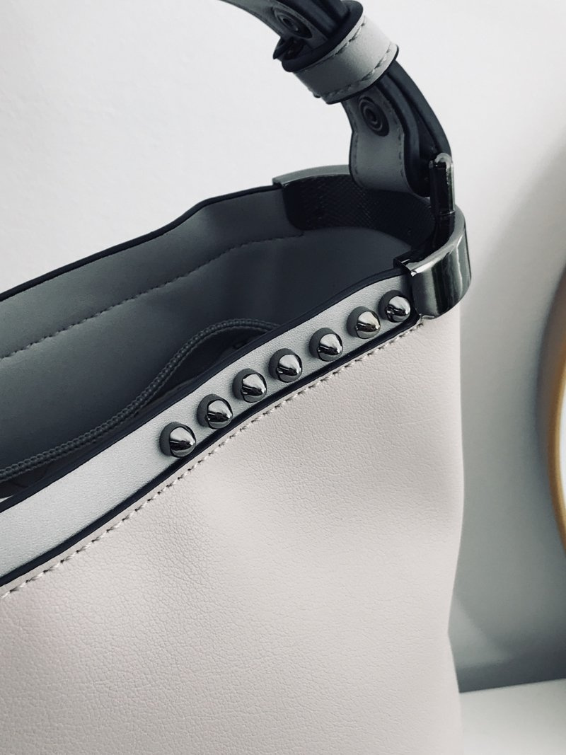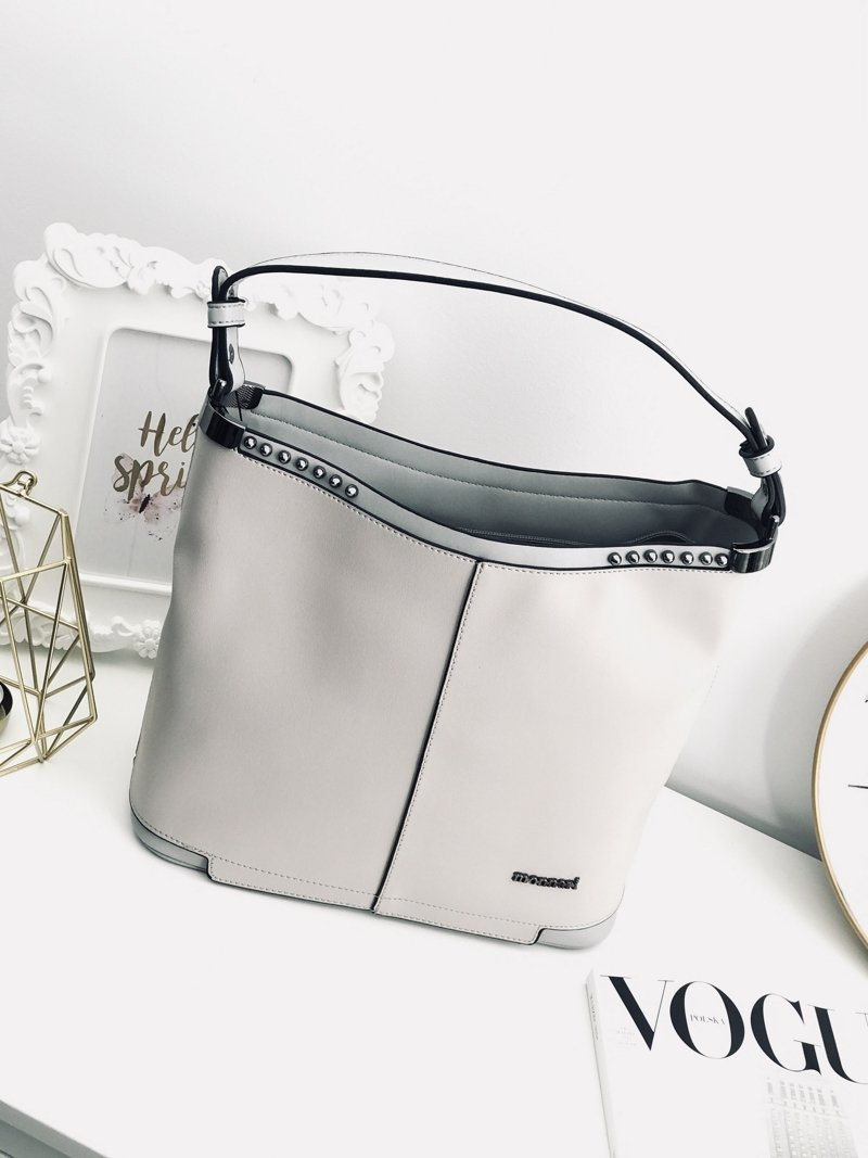 [ Kabelka zdobená lesklými cvočkami a kovovými tvarovkami. Interiér vrecka s ľahkou podšívkou, otvorenými priestormi a vreckami na dokumenty. Na zadnej strane vrecka vrecka na telefóne. Tento model odporúčame ako doplnok k mestskej štylizácii.