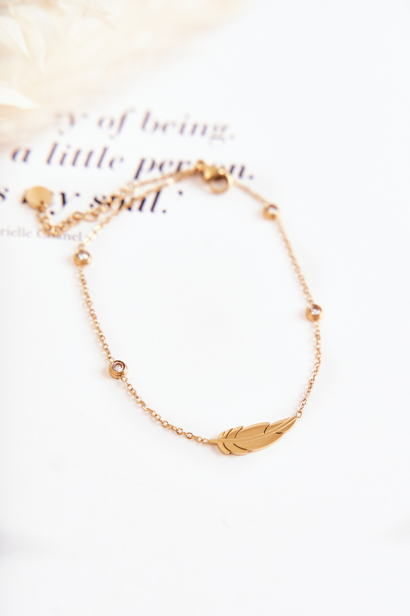 Dámsky, krásny náramok na nohy na tenkej reťazci bol vyrobený z nehrdzavejúcej ocele. Má dekoratívne prvky vo forme peria a zirkónia. Dĺžka dĺžky je možná. Vyzerajte skvele na nohe. Má klasickú sponu. Mali by ste to mať vo svojej zbierke náramkov!