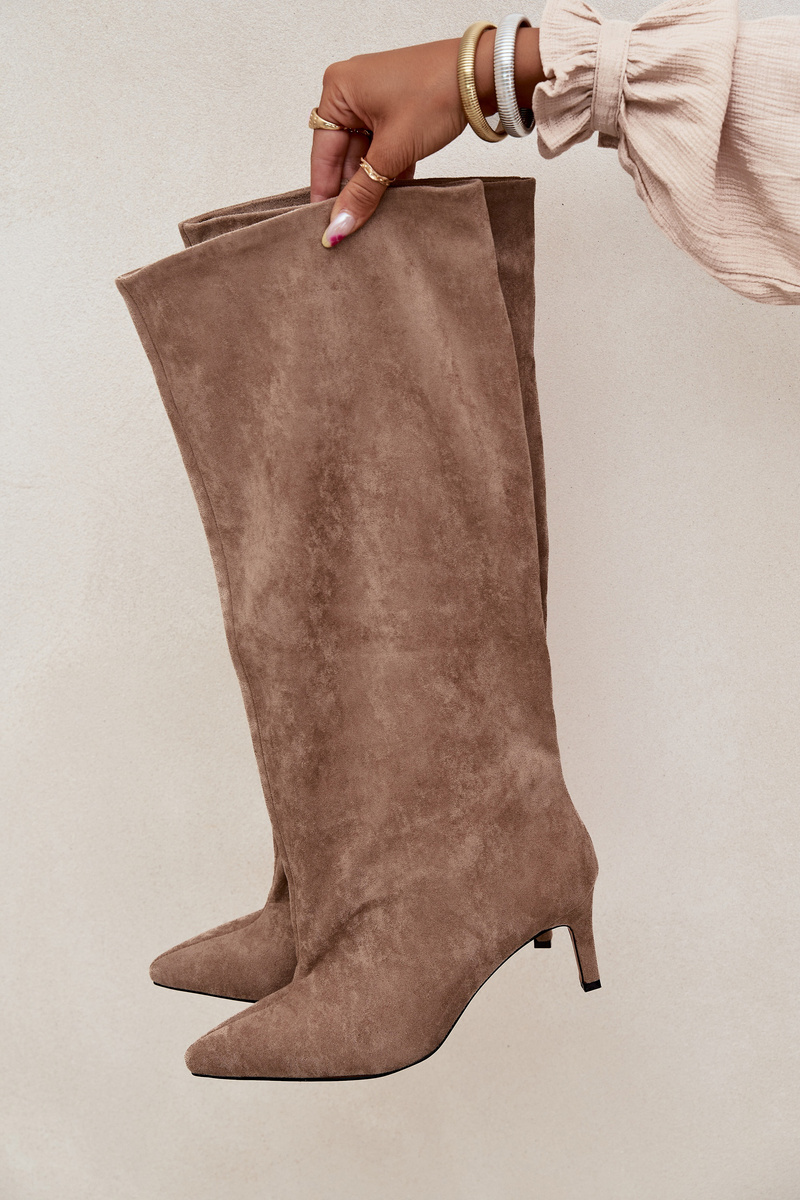 Dámske čižmy z eko semišu sú kombináciou elegancie a moderného štýlu. Ľahko sa nazúvajú a siaha nad kolená, skvele zvýraznia postavu, a podpätok typu stiletto pridáva ľahkosť a šik. Špicaté špičky im dodávajú rafinovaný charakter, vďaka čomu sú čižmy vhodné na elegantné aj výraznejšie módne štýly. Pri výbere veľkosti sa riaďte tabuľkou veľkostí. Při výběru velikosti se řiďte tabulkou velikostí.