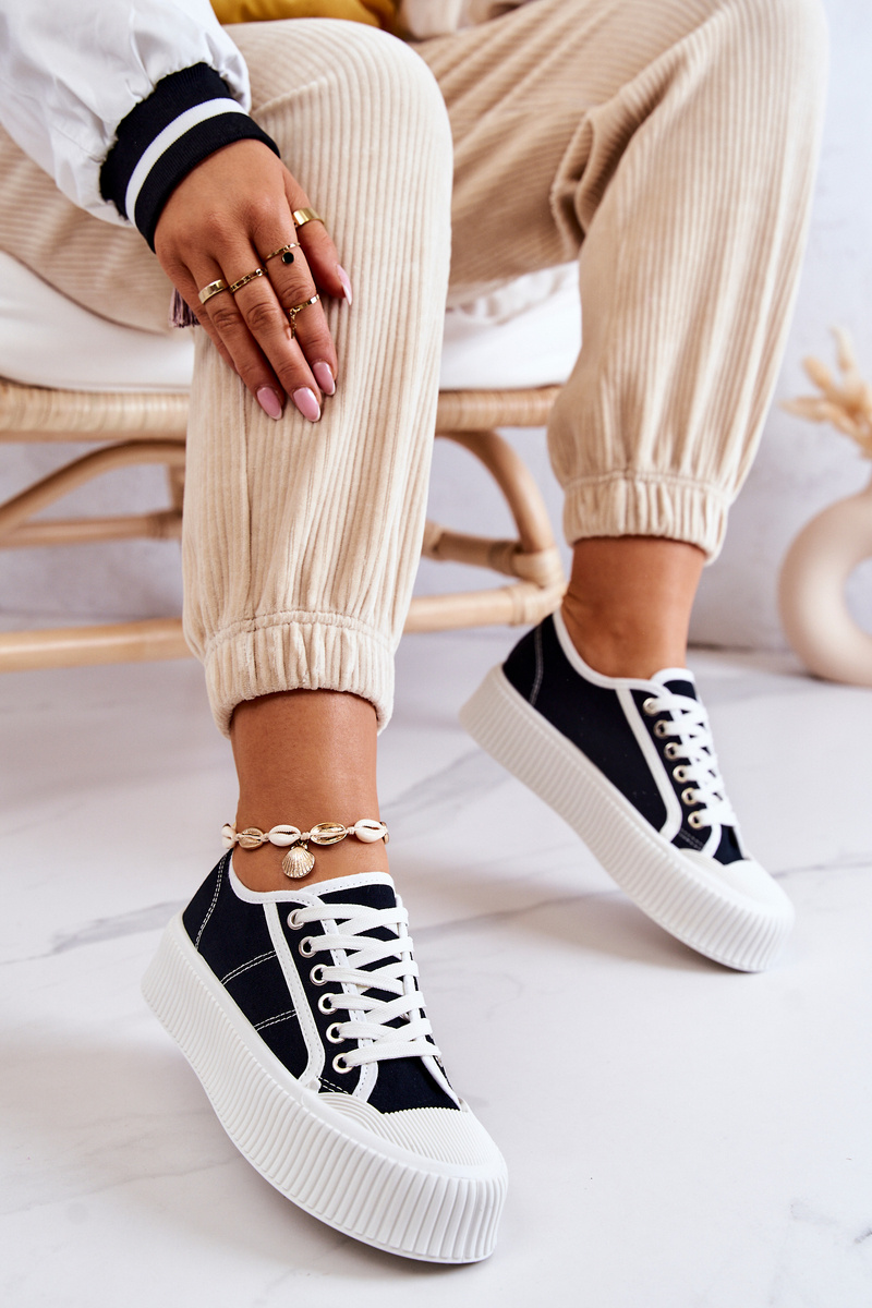 Módne tenisky na masívnej gumovej platforme. Topánky majú hornú časť materiálu a podrážku neklipy. Skvelý model, ktorý bude zodpovedať mnohým štýlom! Nos je zosilnený gumovým plastom. Tenisky majú klasickú väzbu. Nezabudnite sa pozrieť na našu kolekciu tenisiek! Pri výbere veľkosti navrhnite tabuľku veľkosti.