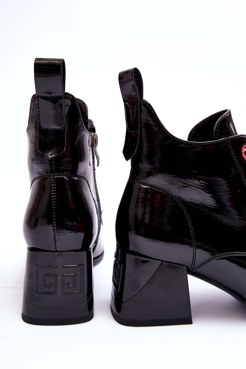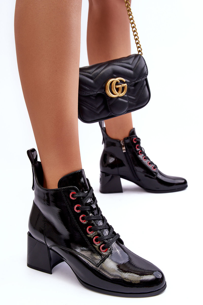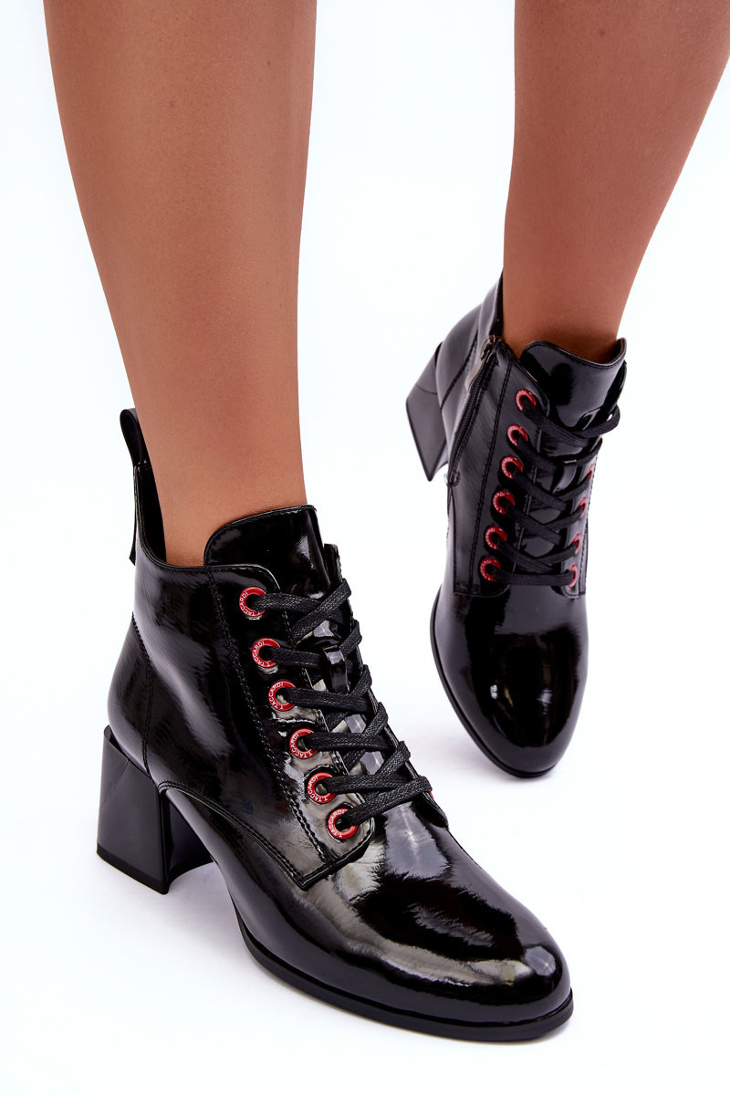 Dámske topánky s nízkou hornou časťou z ekologickej kože. Podpätky zabudované vo forme bloku. Noski v mandlí. Agent izoloval prikrývku topánky. Model pripevnený posúvačom na boku a dodatočne priviazaný. Mäkká vložka zabezpečí pohodlné použitie obuvi. Päta je stuhnutá. Pri výbere veľkosti navrhnite tabuľku veľkosti.