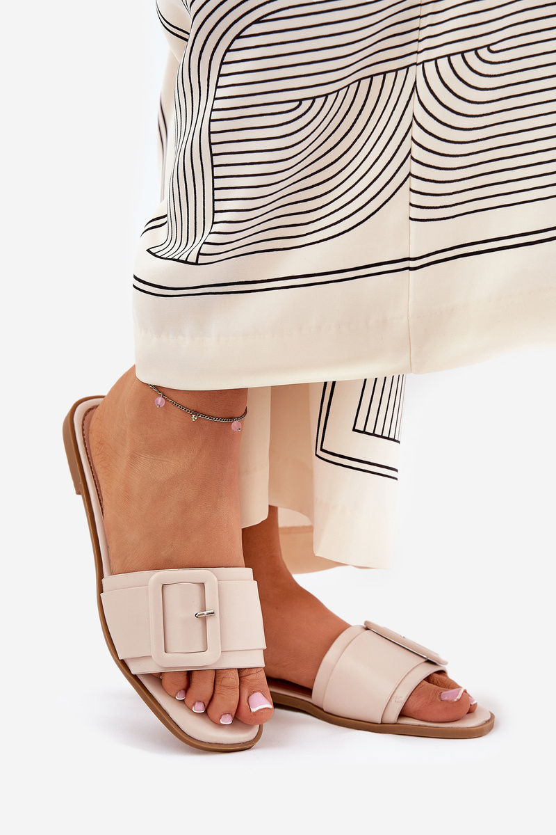 Klasické dámske papuče z eko kože, umiestnené na plochom podpätku, ktoré kombinujú pohodlie s elegantným vzhľadom. Veľká spona na pásku im dodáva jemný charakter. Ideálne na každodenné nosenie, tieto papuče sa skvele hodia k letným štýlom, poskytujúc komfort a jednoduchú eleganciu po celý deň. Při výběru velikosti se řiďte tabulkou velikostí.