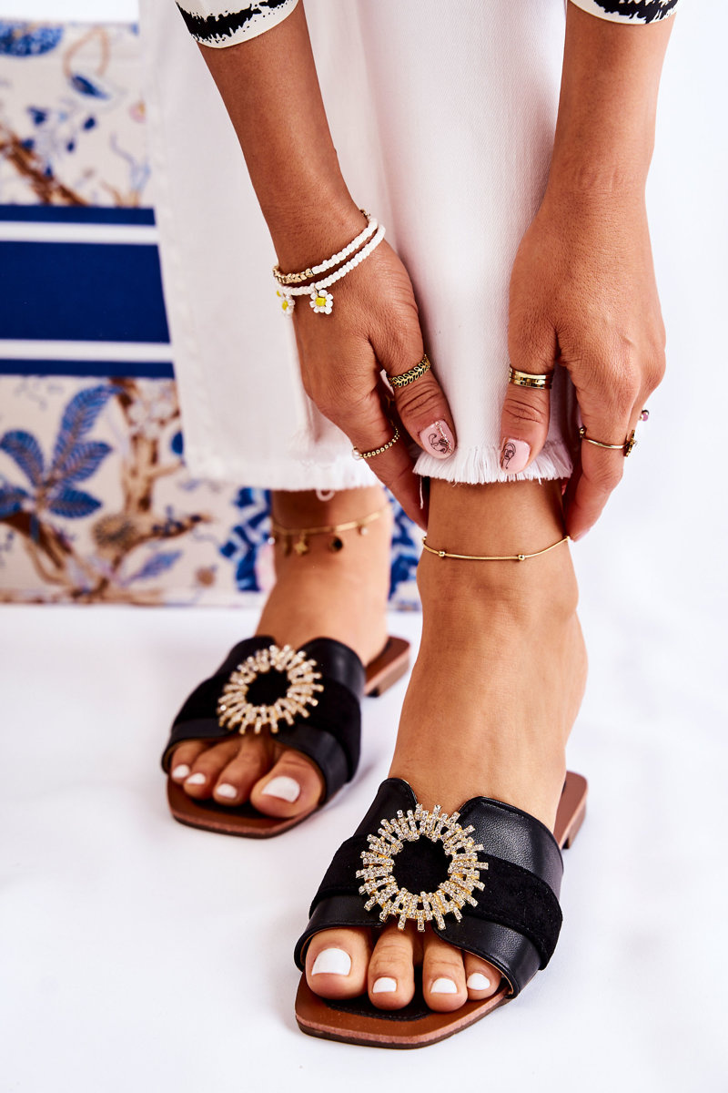 Dámske papuče s moderným strihom. Vyrobené z textilného materiálu a ekologického semišu. Pletený front má tiež dekoratívny prvok vo forme kruhu s kamienkami napodobňujúcimi kamienky. S stielka je pohodlná a mäkká, vyrobená z kombinácie ekologickej kože a plastu. Objavený nos, štvorcový. Ploché žabky s bezpečnými flopmi s podrážkami, ktoré nie sú podrážkami. Módne a pohodlné na použitie - stačí mať tieto žabky! Pri výbere veľkosti navrhnite tabuľku veľkosti.