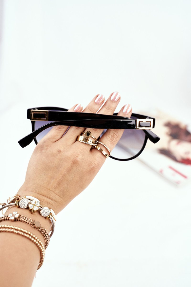 Okuliare majú sklo s krásnym čiernym gradientom a módne dekorácie na chrámoch viditeľných na obrázkoch.Fotografie sú naše autorstvo a predávajú produkt.
