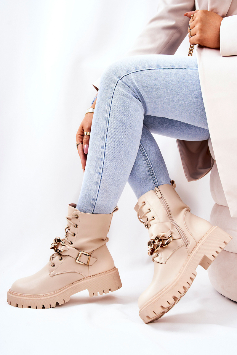 Topánky, ktoré sú neoddeliteľnou súčasťou jesenného a zimného štylizovania. Topánky boli úplne vyrobené z ekologickej kože. Hrubá podrážka a zlatá dekoratívna reťaz spôsobia, že topánky vyzerajú skvele. Interiér topánky nemá izoláciu. Čižmy majú puto a posúvač, ktorý uľahčuje nasadenie. Reťaz pripevnená nastaviteľnou sponou. Pri výbere veľkosti navrhnite tabuľku veľkosti.