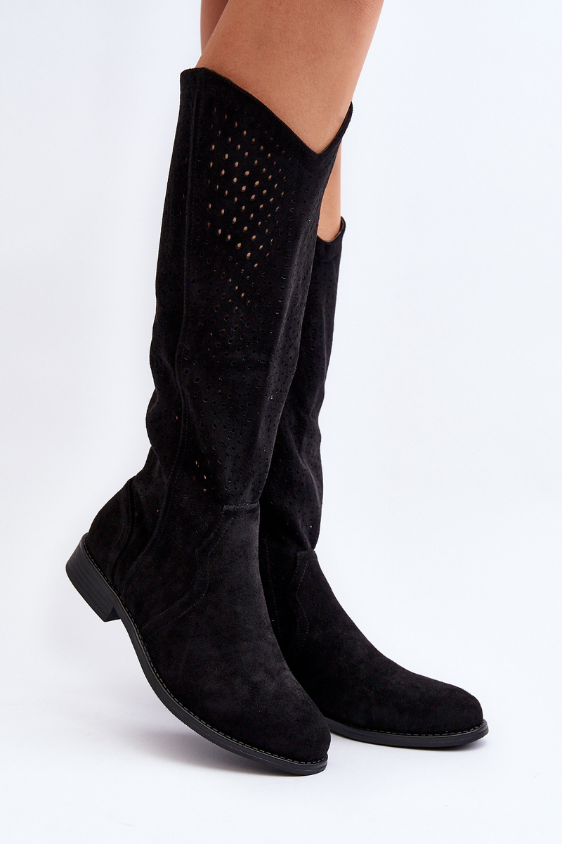 Dámske cowboy čižmy. Vyrobené z ekologickej semišovej kože. Nastavené na plochom, stabilnom podpätku. Zatváranie na bočný zips. Model s otvorenou holenou siahajúcou po koleno. Zakrivené špičky. Ideálne pre mnoho každodenných štýlov! Určite by ste ich mali mať vo svojej skrini! Při výběru velikosti se řiďte tabulkou velikostí.
