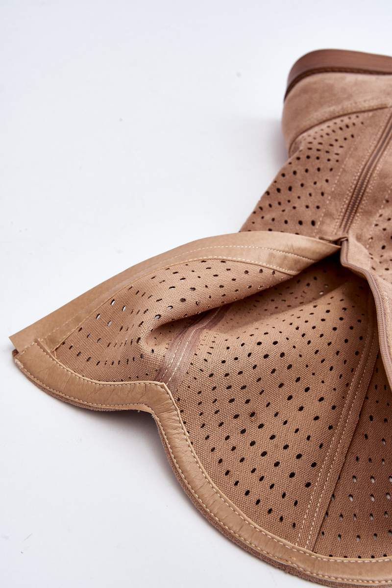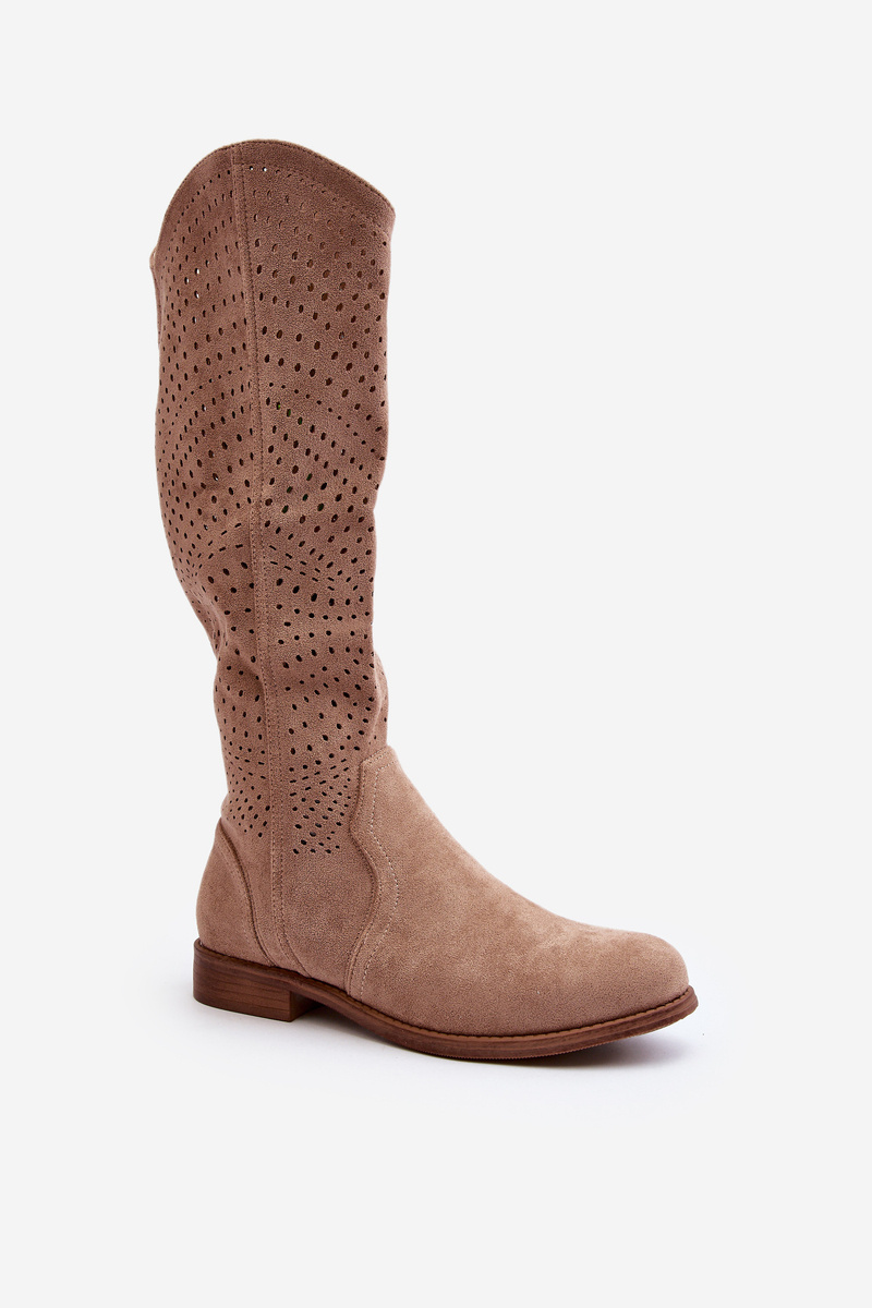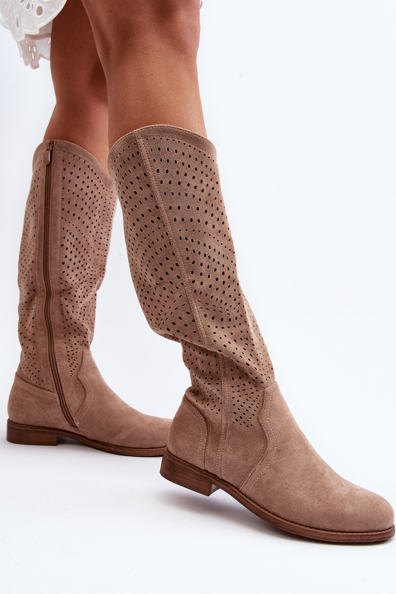 Dámske cowboy čižmy. Vyrobené z ekologickej semišovej kože. Nastavené na plochom, stabilnom podpätku. Zatváranie na bočný zips. Model s otvorenou holenou siahajúcou po koleno. Zakrivené špičky. Ideálne pre mnoho každodenných štýlov! Určite by ste ich mali mať vo svojej skrini! Při výběru velikosti se řiďte tabulkou velikostí.