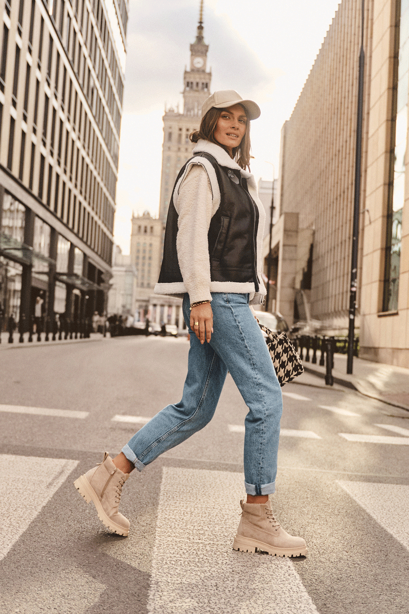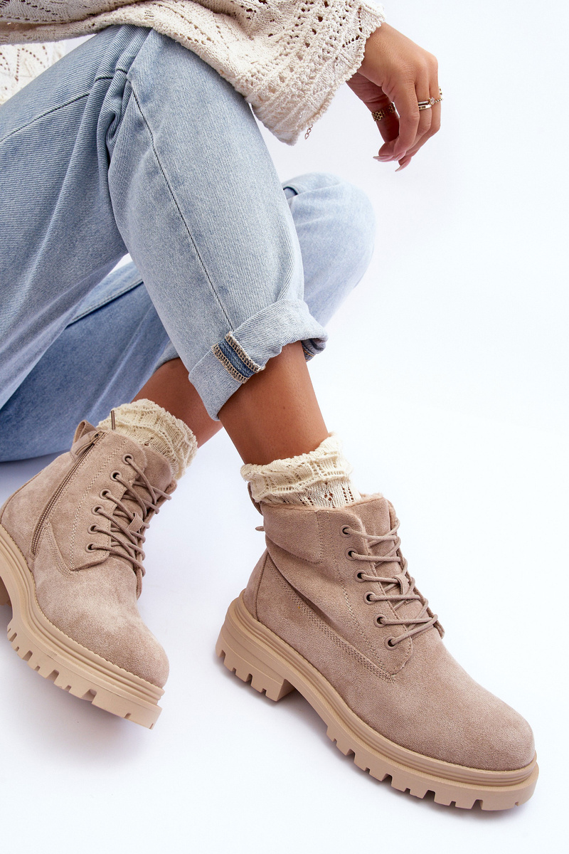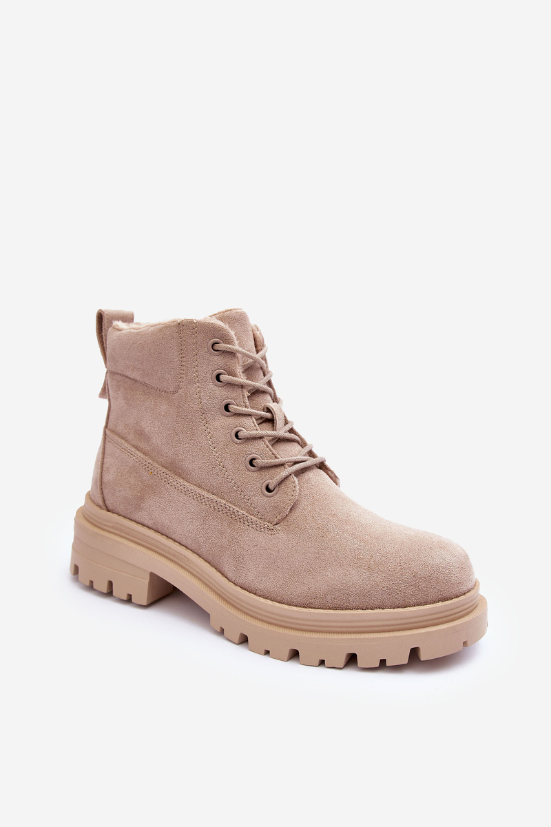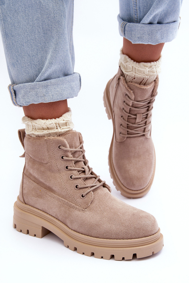 Dámske turistické topánky vyrobené z ekologického semišu. Nastavené na plochú, stabilnú pätu a platformu. Vo vnútri je na dotykovej kožušine teplá a príjemná. Pripevnený zipsom a navyše má šnurovanie. Stuhnuté. Topánky sú ideálne na zimné dni! Pri výbere veľkosti navrhnite tabuľku veľkosti.