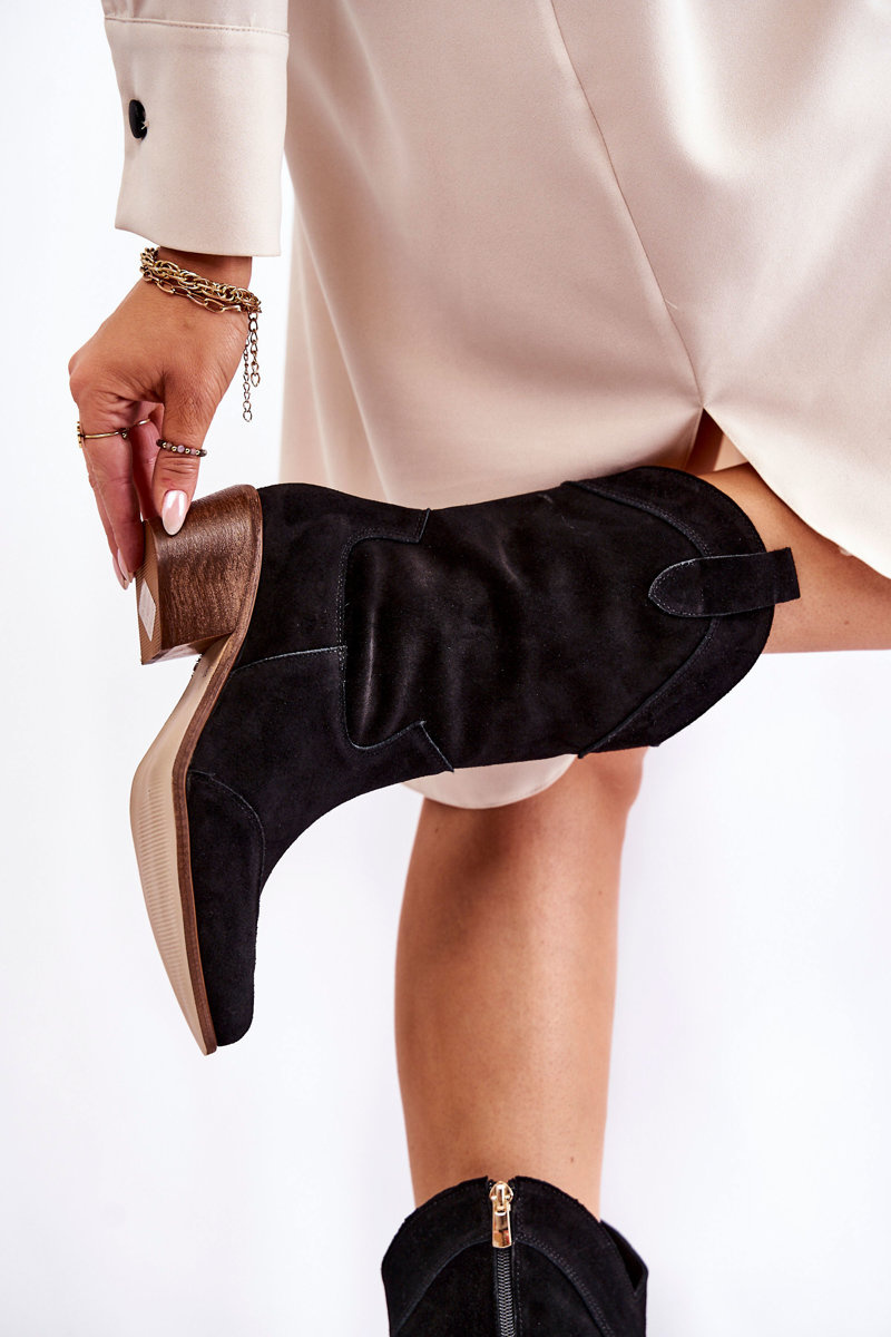 Boots - Kovbojské topánky boli vyrobené z príjemnej prírodnej kože. Majú na prednej strane jemné šitie. Kovbojské topánky majú nos v Spitz a masívne päty vo forme príspevku. Model vložený so zipsom na strane hornej časti. Mäkká, mierne izolovaná vložka. Čižmy majú stuhnutú pätu. Tento jedinečný model by mal byť váš! Pri výbere veľkosti navrhnite tabuľku veľkosti.
