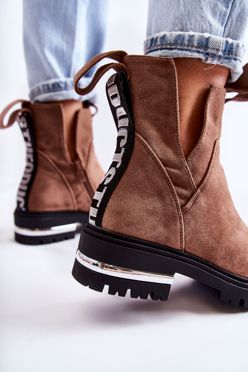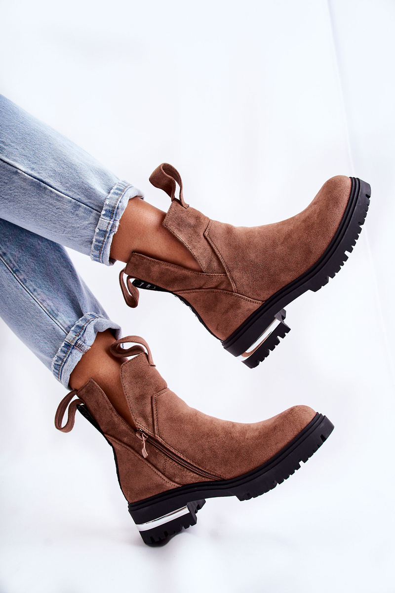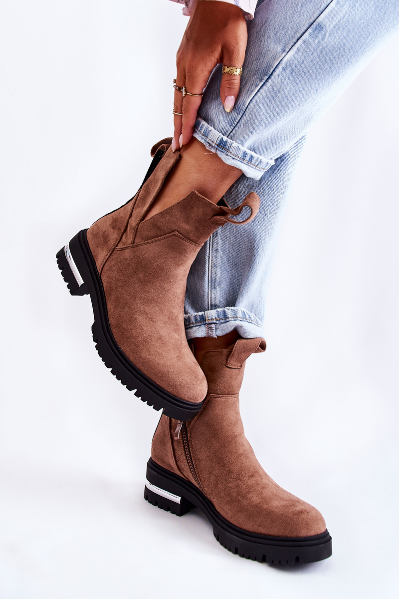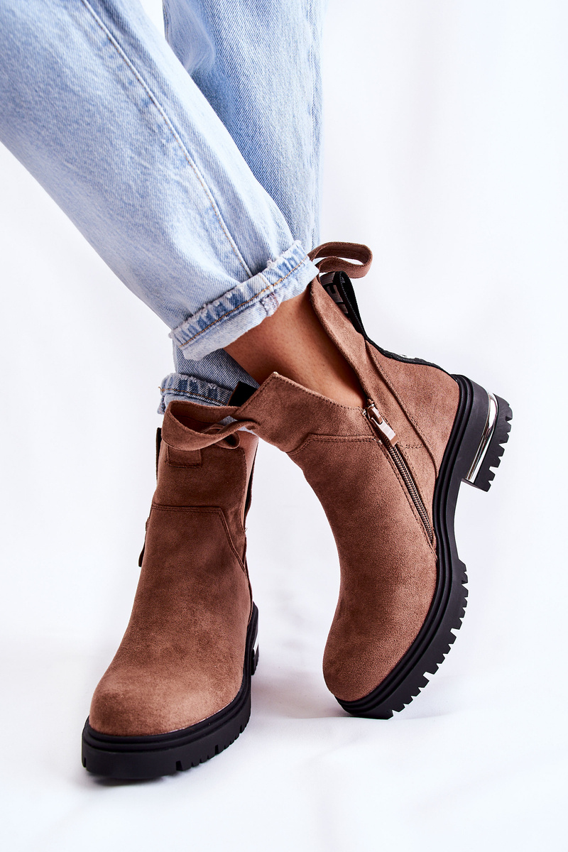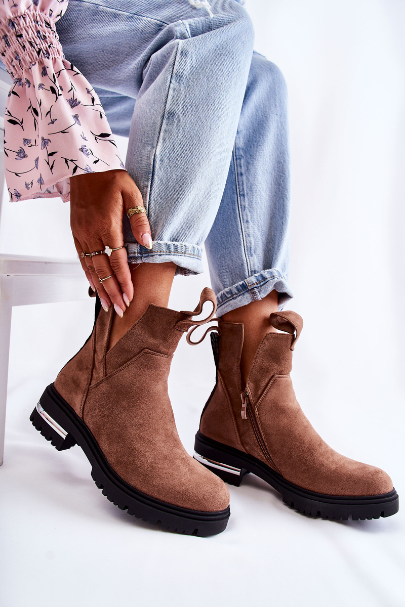 Dámske topánky majú účinné výrezy na bokoch hornej časti. Na prednej a zadnej strane majú slučky na uľahčenie inštalácie obuvi. Okrem toho je na strane hornej posúvača. Topánky boli vyrobené zo semišu ekologického semišu, aby sa dotkli. Majú stuhnutú pätu. Izolovaná vo vnútri obuvou prikrývkou. Meded v plochej päte a nízkej plošine. Pri výbere veľkosti navrhnite tabuľku veľkosti.