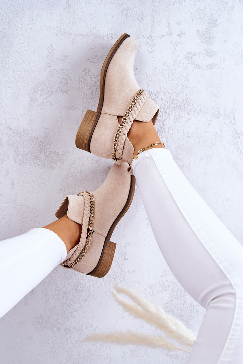 Dámske topánky vyrobené z ekologického semišu zdobené reťazou a opleteným pruhom vo forme copu. Majú plochú pätu. Vo vnútri je vložka materiálu. Majú výrezy na boku hornej časti. Ideálne na jar-leto doby! Tento model by vo vašom šatníku nemalo chýbať! Musíte ich mať! Pri výbere veľkosti navrhnite tabuľku veľkosti.