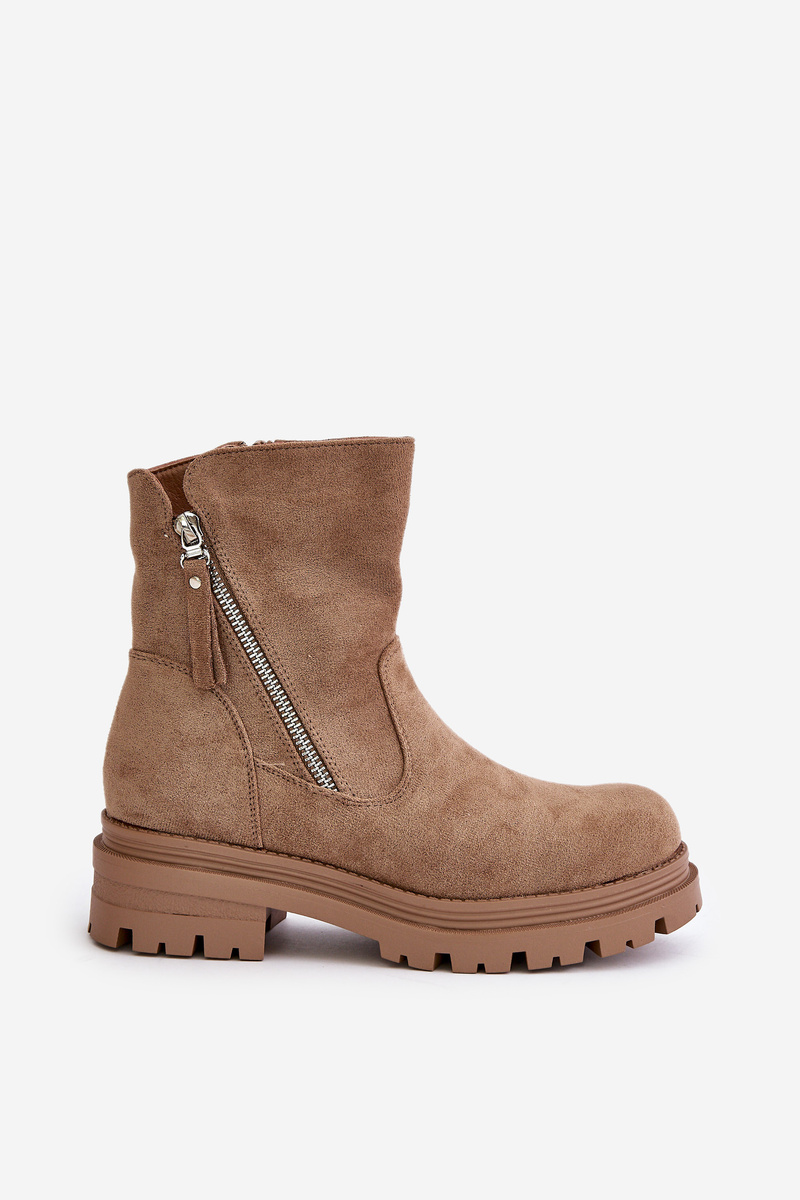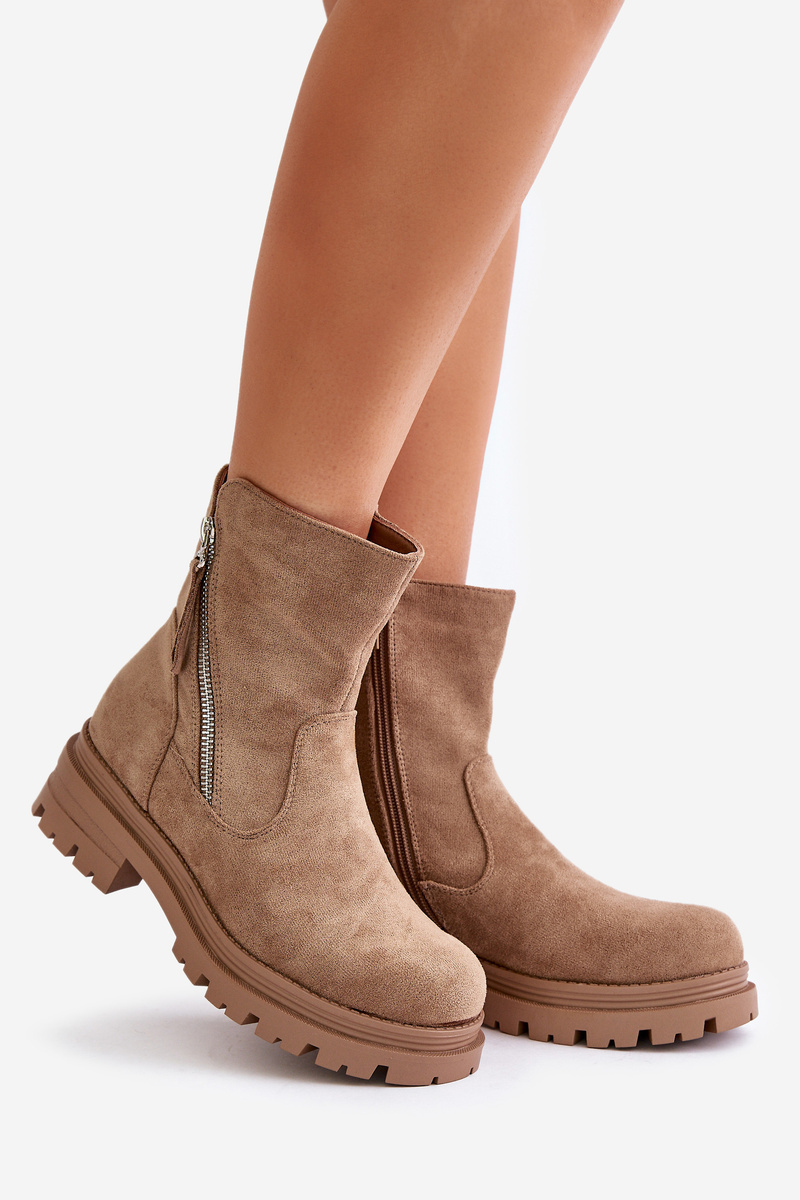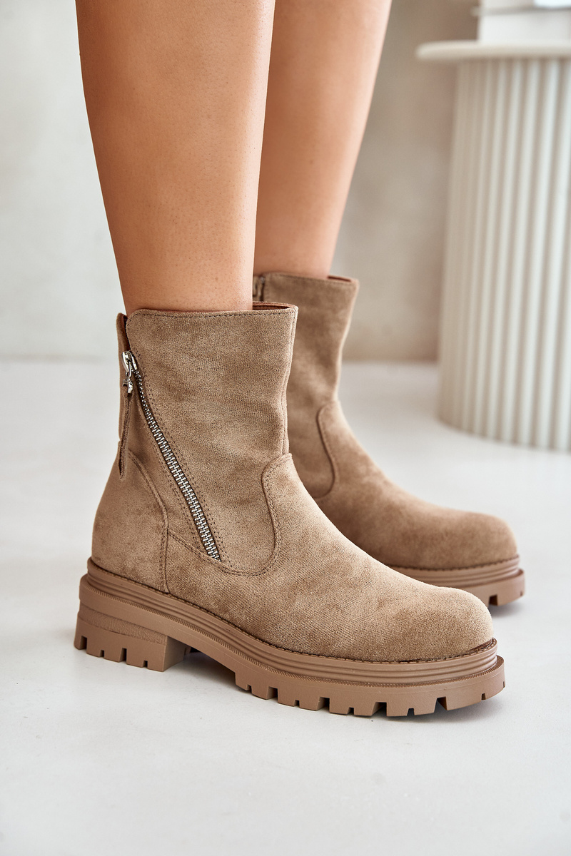 Dámske členkové čižmy vyrobené z ekologickej semišovej kože sú ideálnym riešením na chladnejšie dni. Model je umiestnený na plochom podpätku a platforme, čo zabezpečuje pohodlie a stabilitu. Zaoblené špičky im dodávajú jemný vzhľad a vnútro podšité mäkkou obuvníckou vlnou poskytuje teplo. Zapínajú sa na zips, čo uľahčuje obúvanie a vyzúvanie. Štýlová a praktická voľba na jesennú-zimnú sezónu! Při výběru velikosti se řiďte tabulkou velikostí.