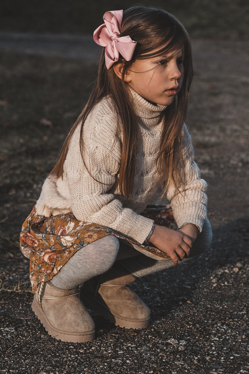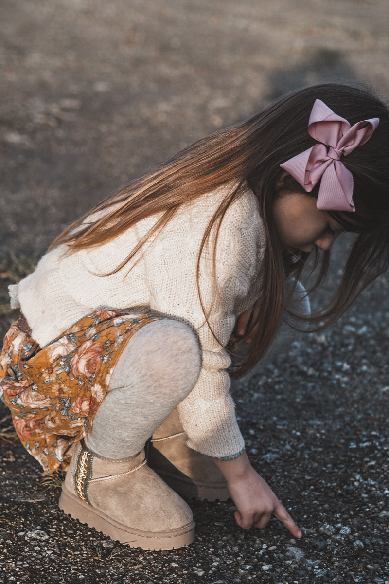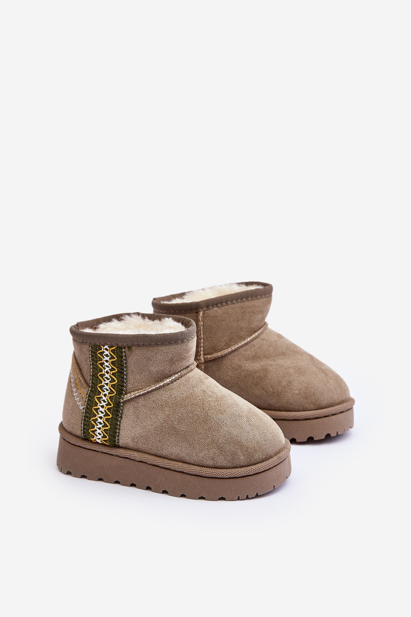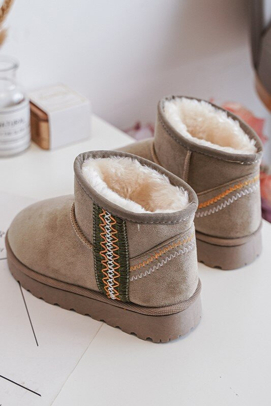 Detské snehové topánky s módnym vzorom na zvršku. Vo vnútri izolovaný so syntetickou, hrubou kožušinou. Vyrobené z ekologického semišu. Hrubá gumová podrážka bude chrániť pred studenou zemou. Tento model je k dispozícii aj vo veľkostiach žien. Vytvorte set mamu + dieťa! Pri výbere veľkosti nasmerujte tabuľku veľkosti.