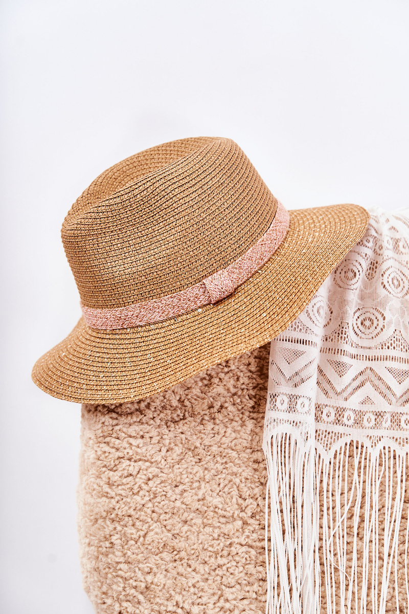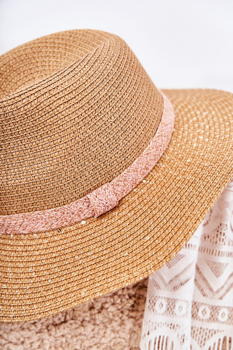 Ľahký ženský klobúk s flitrami. Klobúk je vyrobený z tkaného papiera. Kruhový objazd je zdobený ružovým popruhom. Vo vnútri je reťazec, ktorý vám umožňuje upraviť klobúk. Nezabudnite skontrolovať našu kolekciu klobúkov! Zloženie: 82 % papier, 12 % polyester, 6 % metalizované vlákno.