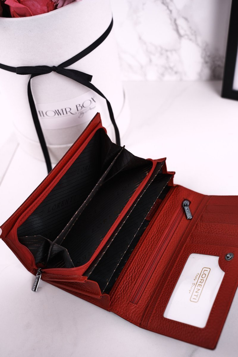 Elegantné ženské portfólio Lorenti. Portfólio sa ubytuje mince, bankovky a platobné karty. Vyrobené z lakovanej prírodnej kože, zakončené zvieracej výtlačkom.