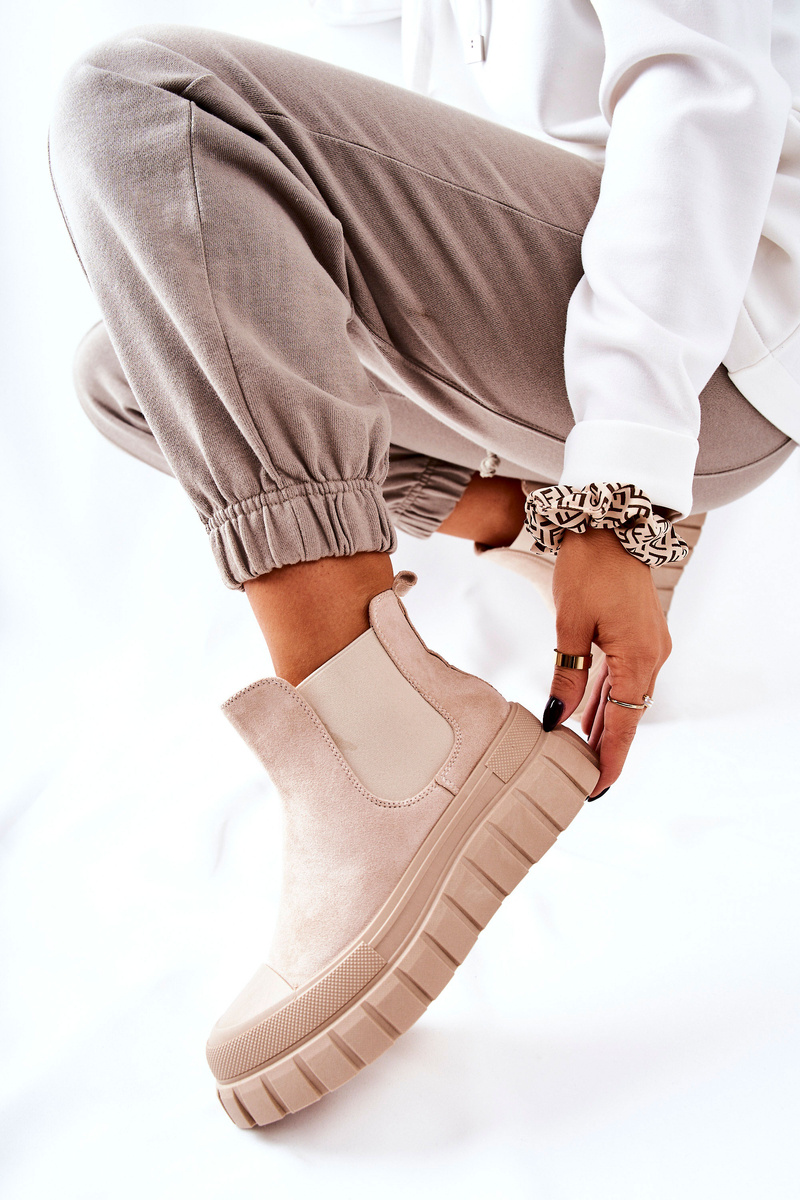 Boots boli vyrobené z ekologického semišu. Zalievanie gumy vo výške hornej časti zaisťujú prispôsobenie nohe a pohodlie. Vďaka vysokej plošine je topánky pohodlné na nosenie. Agent je izolovaný jemným, príjemným na dotykovú kožušinu. Čižmy majú výstuž vo forme gumy. Pri výbere veľkosti navrhnite tabuľku veľkosti.