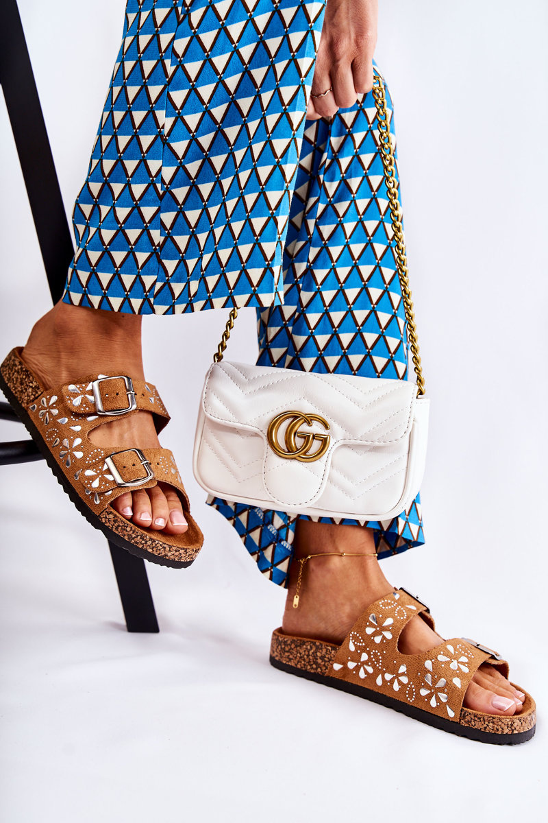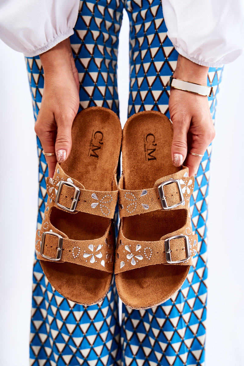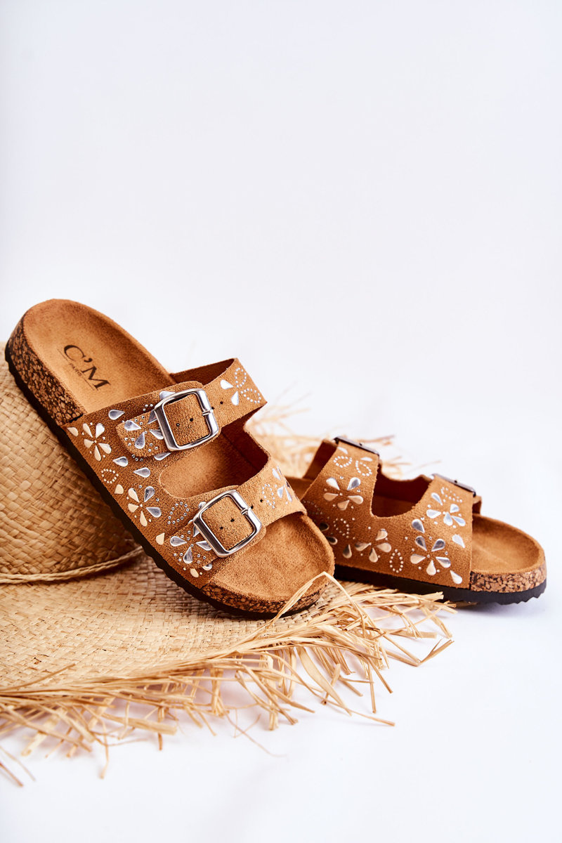 Klasické ženské žabky boli vyrobené z ekologického semišu. Postavené na korkovej plošine s plastovou podrážkou. Majú dva nastaviteľné pruhy s prackou, vďaka čomu môžete obuv správne upraviť vašim potrebám. Na pruhoch sú dekoratívne trysky. Pohodlná, profilovaná ekologická semišová vložka. Perfektné každý deň! Model s otvoreným, zaokrúhleným špičkou. Pri výbere veľkosti navrhnite tabuľku veľkosti.