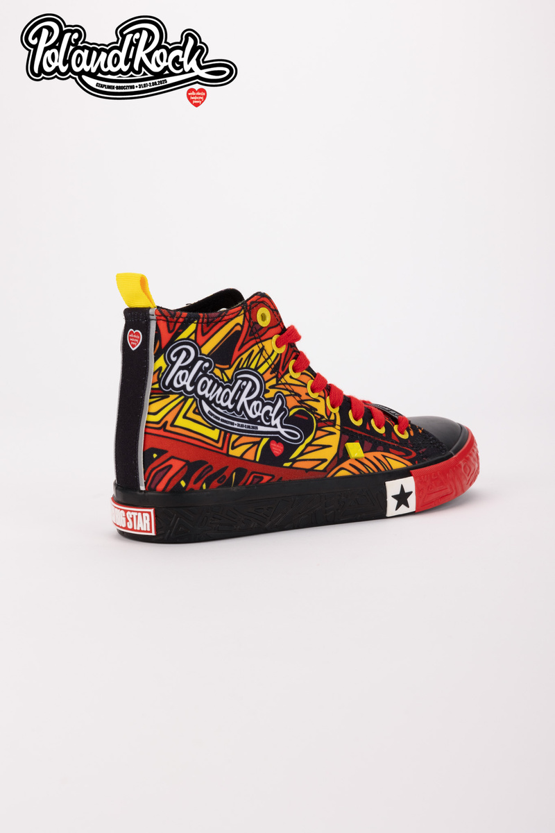 MODEL ROCK Jedinečný vzhľad Tento model navrhol tím grafikov Jurka Owsiaka a je skutočnou explóziou farieb a emócií – červená, žltá a čierna vytvárajú dynamickú kompozíciu, ktorá okamžite pritiahne pohľad. Na bočnej strane topánky sa nachádza oficiálne logo Pol’and’Rock, obklopené grafickými motívmi inšpirovanými pouličným umením, hudbou a slobodou. Červené šnúrky a čierna podrážka zdôrazňujú výrazný charakter topánok, a celé to dopĺňa vysoká kvalita spracovania, ktorou sa značka Big Star Shoes preslávila. Odolnosť a pohodlie Vyrobené z kvalitných materiálov, zaisťujú pohodlie pri nosení počas celého dňa. Pevná gumová podrážka zaručuje vynikajúcu priľnavosť a ochranu nohy na nerovnom teréne, a kvalitné materiály zabezpečujú trvanlivosť a odolnosť voči poškodeniu. Tenisky sú ľahké, pohodlné a ideálne na tanec pod pódiom, prechádzky po kempingovom poli alebo len na každodenné nosenie s nádychom festivalového štýlu. Limitovaná edícia Jedinečnosť tenisiek Big Star Shoes robí z nich skutočný klenot pre zberateľov a ľudí, ktorí sledujú najnovšie trendy. Pamiatka Tieto tenisky vám umožnia uchovať si spomienku na 31. edíciu festivalu Pol’and’Rock na dlhú dobu. Festivalová fotografia s vašou polovičkou alebo priateľmi? Nezabudnite, že môžete spojiť sily a vybrať si zhodné obuv pre všetkých účastníkov. Při výběru velikosti se řiďte tabulkou velikostí.