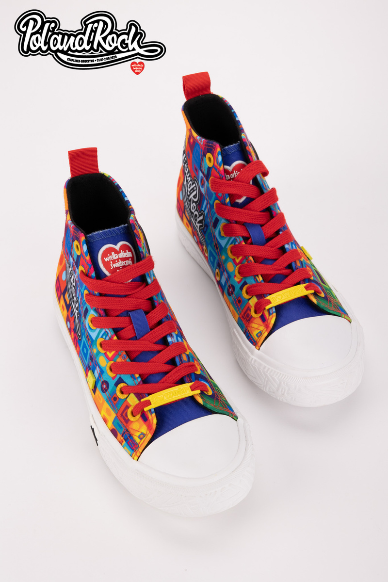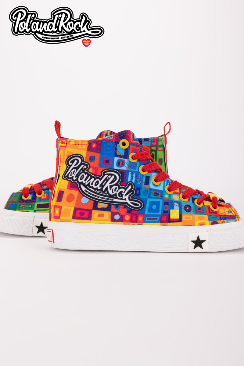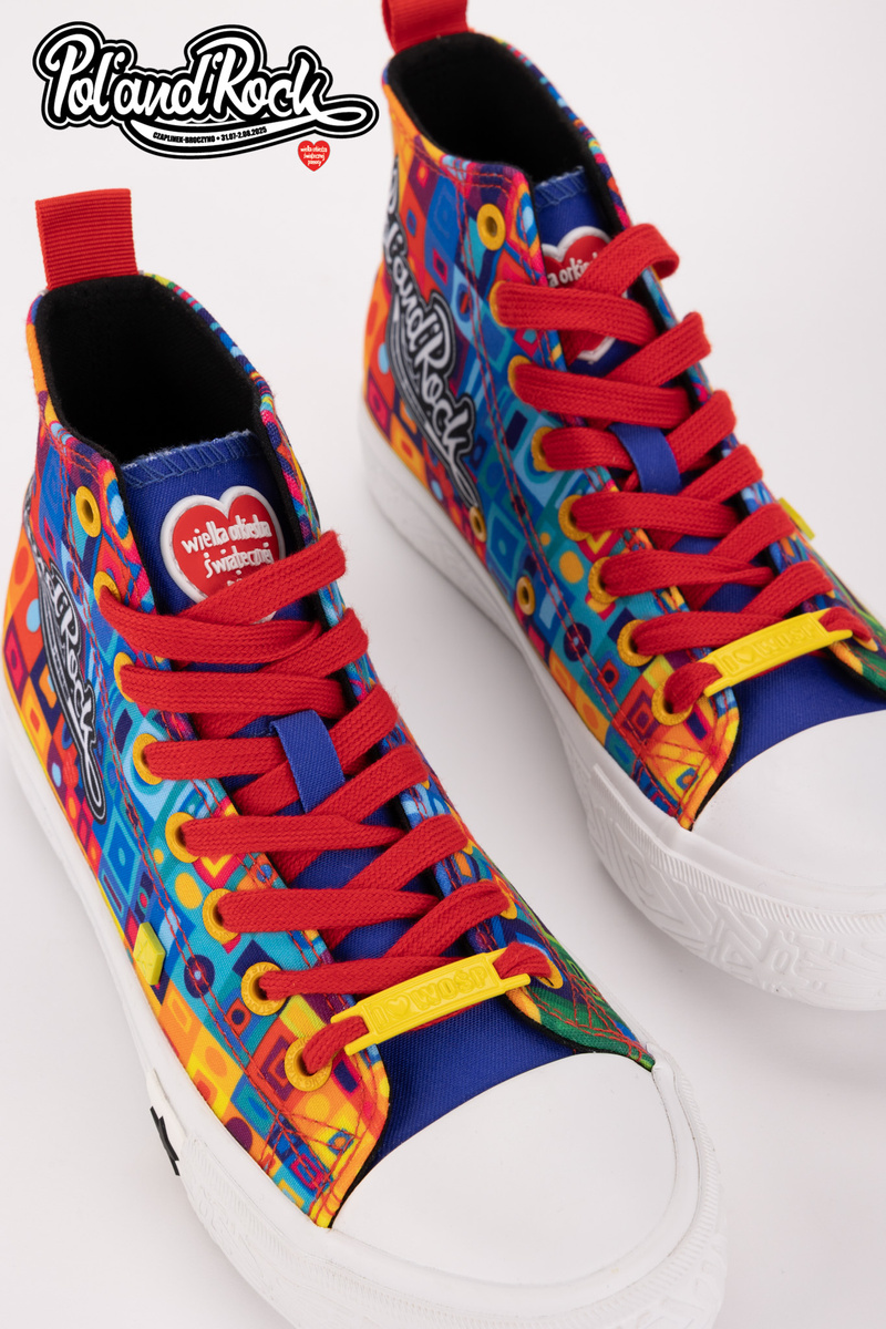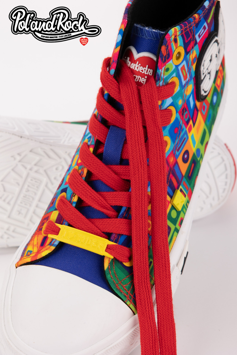 MODEL MOZAIKA Jedinečný vzhľad Model týchto topánok navrhol tím grafikov Jurka Owsiaka. Je to pravá explózia farieb a symbolov. Zelený, modrý a červený zvršok je pokrytý umeleckými vzormi, ktoré evokujú festivalové graffiti, spontánnosť a radosť. Na zadnej strane topánok sa nachádza červený pásik s bielym srdcom - subtílny, ale výstižný akcent, ktorý symbolizuje lásku k hudbe a ľuďom. Práve tieto hodnoty sú základom festivalu Poland’and’Rock a boli prenesené na každý centimeter tohto jedinečného modelu. Odolnosť a pohodlie Vyrobené z kvalitných materiálov, zaručujú pohodlie pri nosení počas celého dňa. Pevná gumová podrážka zaručuje vynikajúcu priľnavosť a ochranu nohy na nerovnom teréne, zatiaľ čo kvalitné materiály zabezpečujú trvanlivosť a odolnosť voči poškodeniu. Tenisky sú ľahké, pohodlné a ideálne na tanec pod pódiom, prechádzky po stanovom mestečku alebo jednoducho na každodenné nosenie s nádychom festivalovej pohody. Limitovaná edícia Jedinečnosť tenisiek Big Star Shoes robí z nich pravú raritu pre zberateľov a ľudí, ktorí sledujú najnovšie trendy. Pamiatka Tieto tenisky vám pomôžu uchovať spomienku na 31. ročník festivalu Pol’and’Rock na dlhú dobu. Festivalová fotografia s vašou polovičkou alebo priateľmi? Nezabudnite, že môžete spojiť sily a vybrať si jednotnú obuv pre všetkých účastníkov. Při výběru velikosti se řiďte tabulkou velikostí.