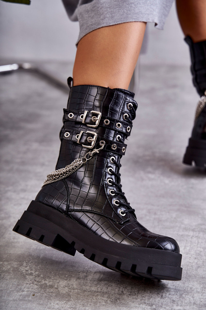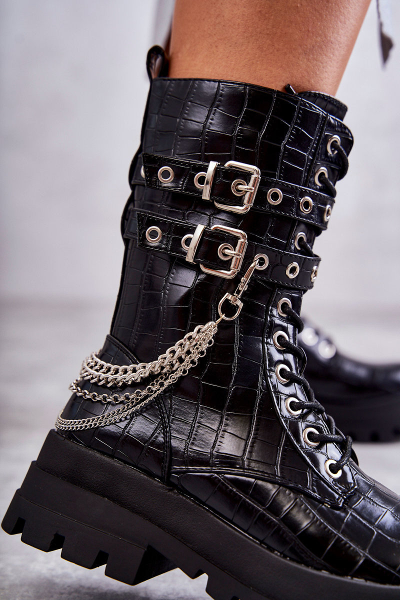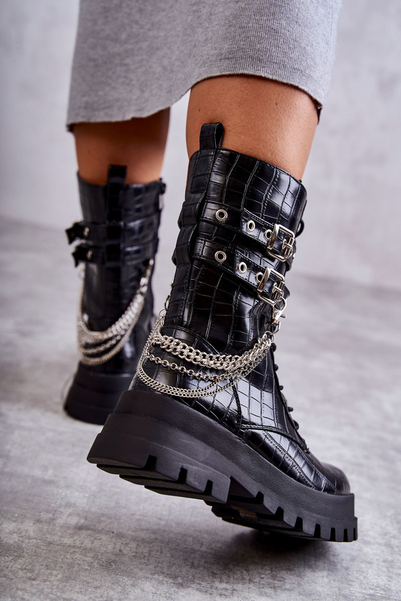 Unikátne, vysoké dámske topánky boli vyrobené z ekologickej kože. Miešené v plochej päte a masívnej podrážke. Čižmy majú nastaviteľné prúžky pripevnené k pracne. Okrem toho je tento model zviazaný a pripevnený zipsom. Dekoratívna reťaz je oddelená. Čižmy majú stuhnutú pätu. Agent je izolovaný peknou obuvou prikrývkou. Pri výbere veľkosti navrhnite tabuľku veľkosti.