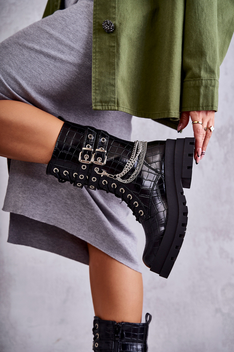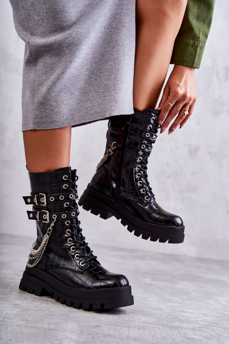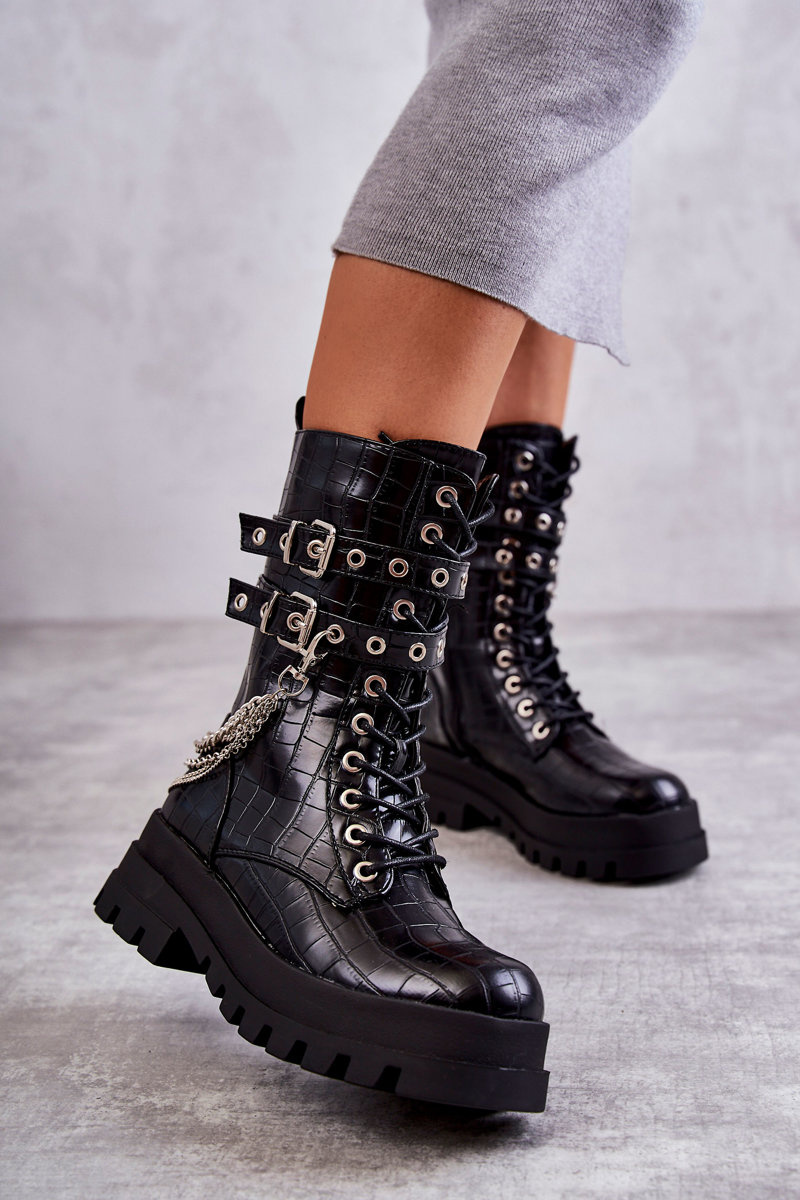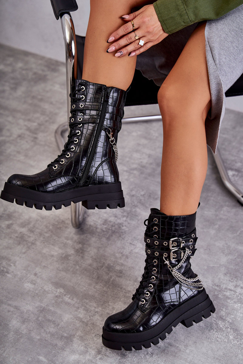 Unikátne, vysoké dámske topánky boli vyrobené z ekologickej kože. Miešené v plochej päte a masívnej podrážke. Čižmy majú nastaviteľné prúžky pripevnené k pracne. Okrem toho je tento model zviazaný a pripevnený zipsom. Dekoratívna reťaz je oddelená. Čižmy majú stuhnutú pätu. Agent je izolovaný peknou obuvou prikrývkou. Pri výbere veľkosti navrhnite tabuľku veľkosti.