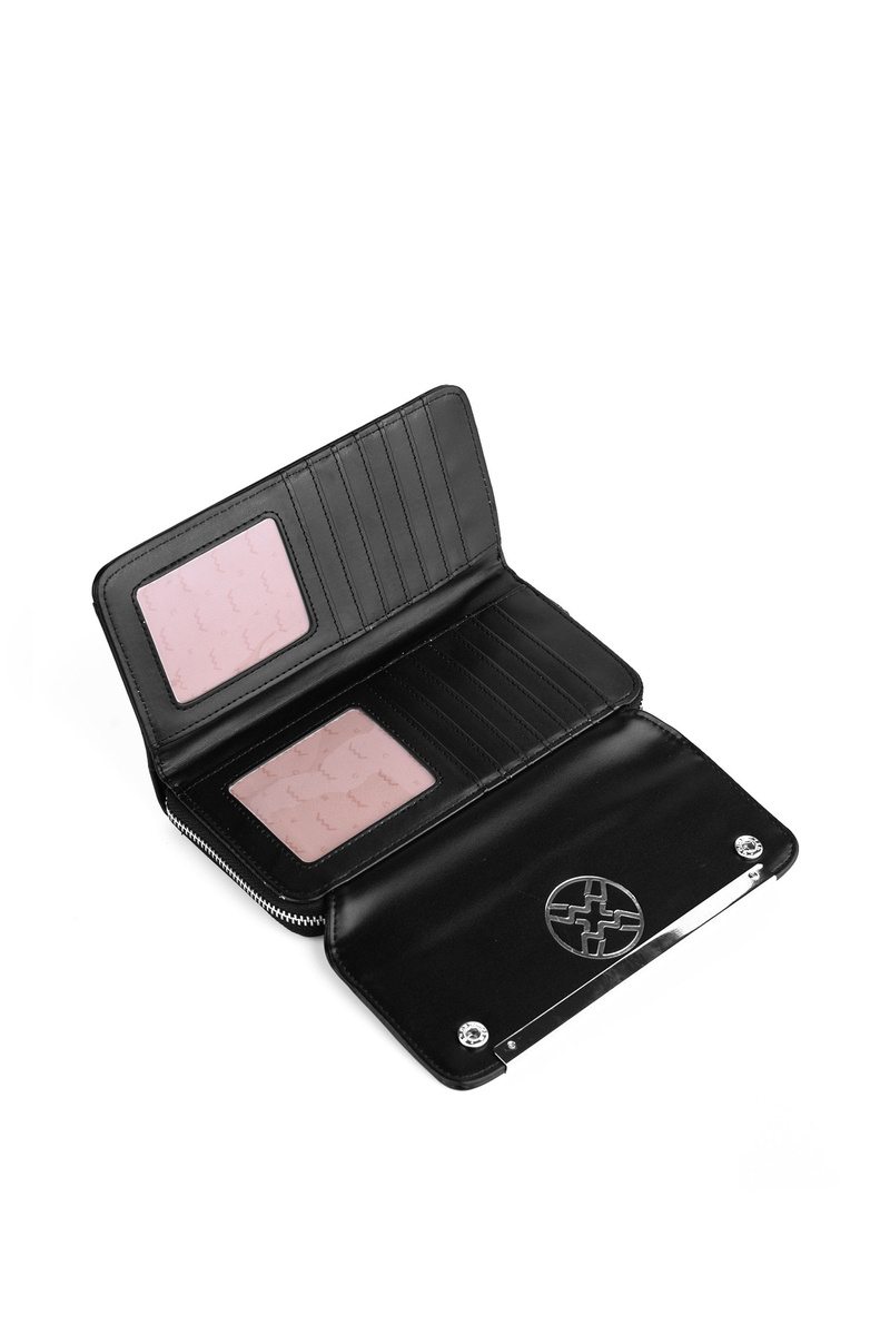 Elegantná, veľká peňaženka pripevnená lisom a zipsom. Vyrobené z ekologickej kože, s kovovou vložkou vpredu a znakom. Má štyri miesta pre fotografiu a veľké množstvo otvorených vreciek pre vizitky, preukaz totožnosti alebo kreditné karty. V komore zipsov sú ďalšie otvorené vrecká a miesto pre bankovky. Peňaženka má tiež vrecko pripevnené posúvačom, v ktorom môžete ukladať mince.