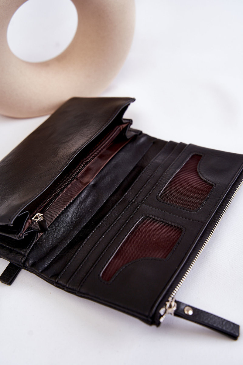Klasická, veľká dámska peňaženka bola vyrobená z ekologickej kože. Uzavreté magnetom. Komora má otvorené vrecká a jedno uzavreté zipsom. Peňaženka navyše obsahuje priestor pre vizitky, identifikačné karty a miesto pre fotografiu. Vrecká v klapke a vzadu sú uzavreté zipsom.