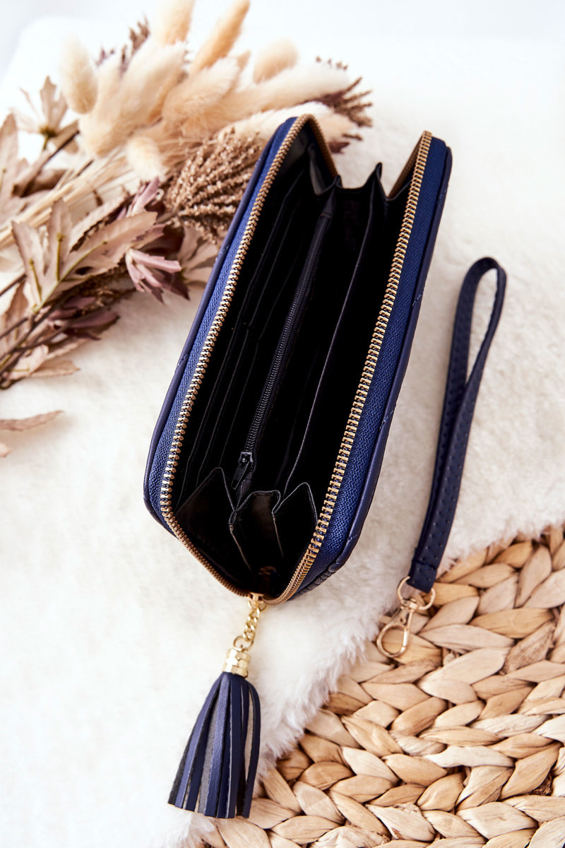 Veľká peňaženka pripevnená z vonkajšej strany na zips. Z vonkajšej strany bol vyrobený z prešívanej ekologickej kože. Na hrade je strapce. Okrem toho remienok obsahuje súpravu. Vnútri, miesto pre mince, bankovky a vizitky. Nezabudnite skontrolovať naše ďalšie peňaženky!