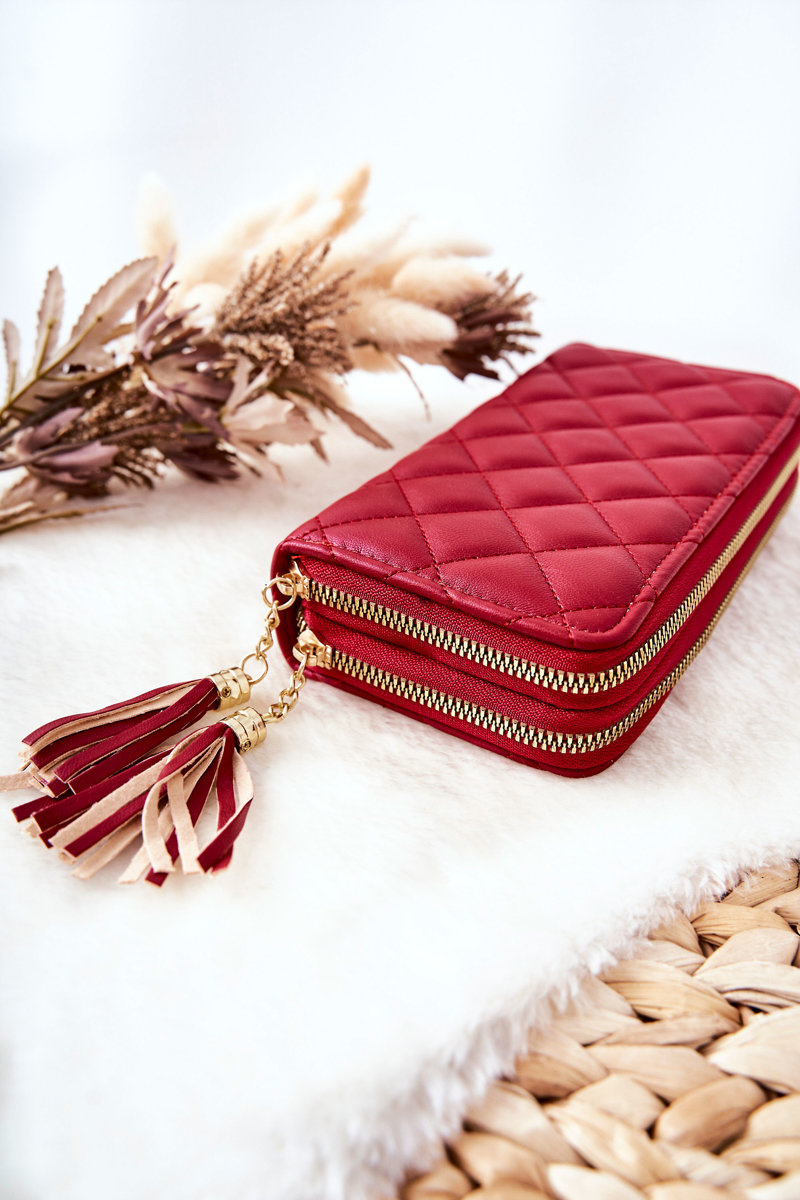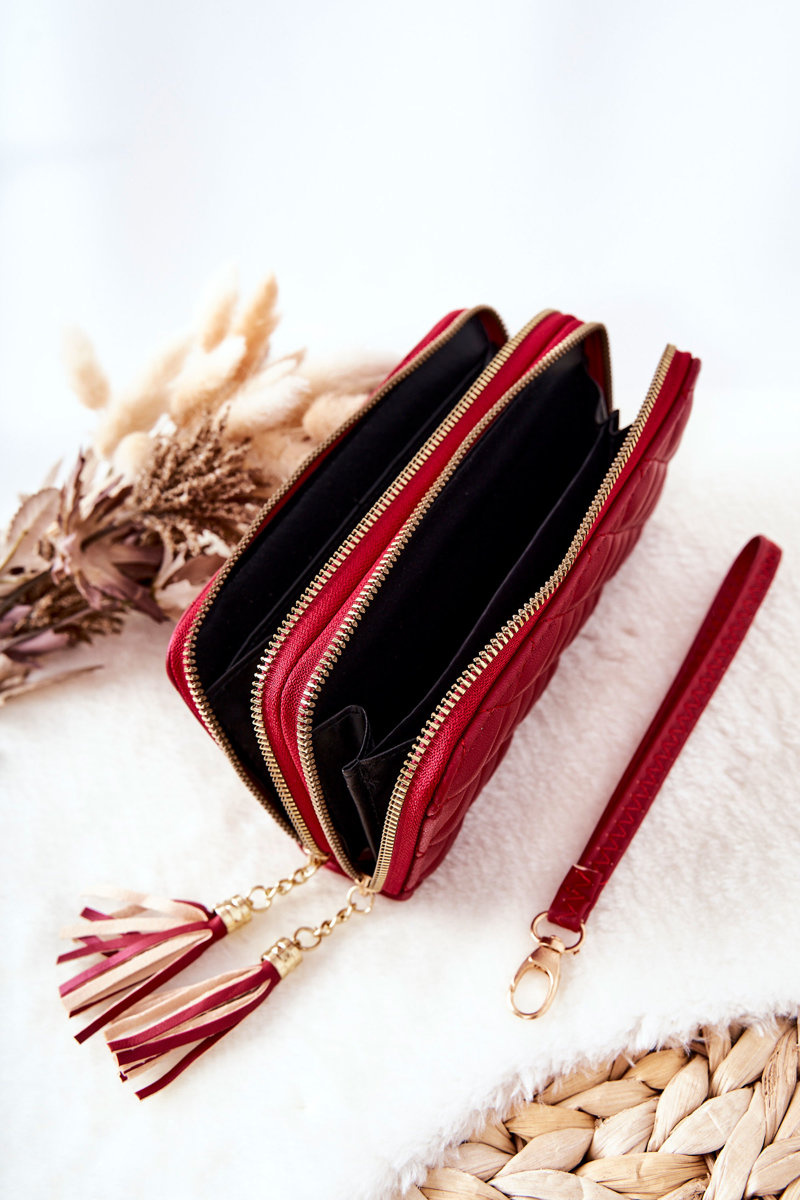 Veľká a praktická peňaženka pripevnená zvonka pre dva zipsy. V jednom z priehradiek nájdete miesto pre mince, bankovky a vizitky, zatiaľ čo v druhom môžete vložiť malý smartphone alebo bankovky alebo dokumenty. Z vonkajšej strany bola peňaženka vyrobená z prešívanej ekologickej kože a vedľa hradov sú strapce. Okrem toho remienok obsahuje súpravu.