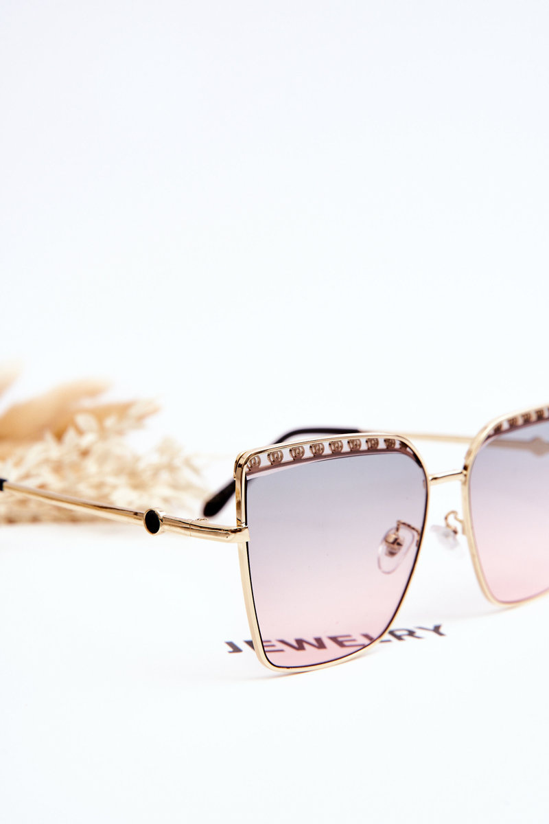Unikátne slnečné okuliare boli vyrobené z plastového a kovového pripojenia. Model v štýle motýľa s krásnou dekoráciou zvnútra na vrchu objektívu. Okresy majú navyše tenké rámy a chrámy. Silikónové prsty vám umožnia správne namontovať okuliare. Informácie od výrobcu: UV 400, kategória 3.