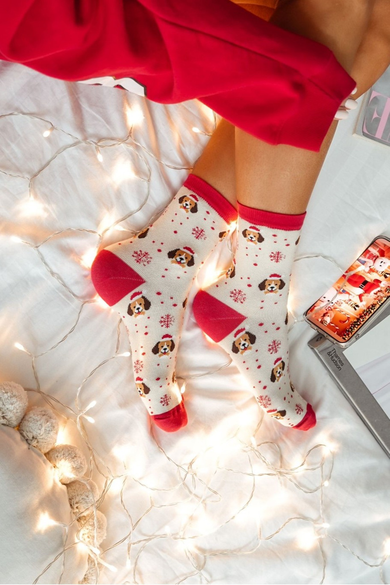 Vianočné Dámske Ponožky Psy V Čiapke Mikuláša Béžové