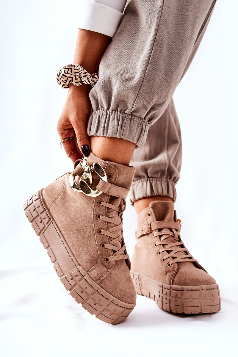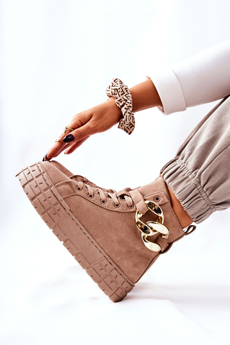Topánky boli vyrobené zo semišovej ekologickej kože. Vysoké tenisky majú na opasku dekoratívnu reťaz, ktorá je pripevnená prackou. Môže byť tiež úplne odstránený. Topánky majú vysokú stabilnú platformu. Vo vnútri je vložka materiálu. Nezabudnite skontrolovať našu zostávajúcu ponuku tenisiek na platforme! Pri výbere veľkosti navrhnite tabuľku veľkosti.