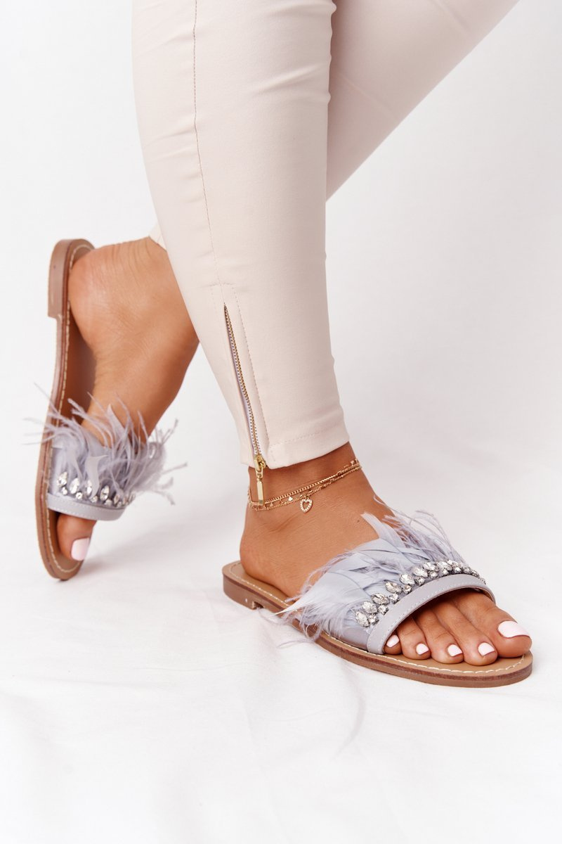 Dámske flip -flops značky lu boo zdobené perie a strieborné kamene. Pliséry sú skvelým návrhom pre ženy, ktoré si cenia pohodlie v letných dňoch! Nezabudnite skontrolovať našu kolekciu topánok Lu Boo. Pri výbere veľkosti navrhnite tabuľku veľkosti.