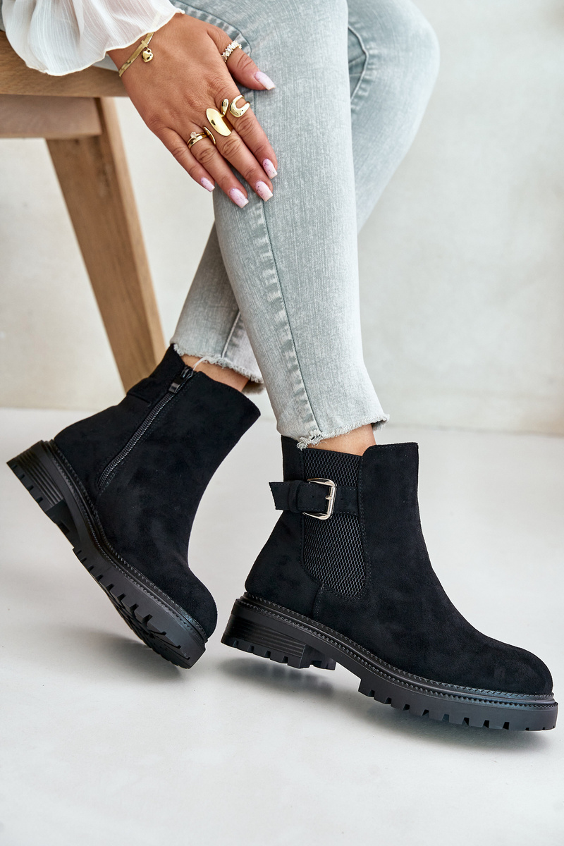 Nízke čižmy vyrobené z eko zamsu. Umiestnené na plochom, stabilnom opätku. Zapínanie na zips. Zaoblené prsty. Vnútro je izolované obuvníckou vlnou. Na zvršku je pás s prackou. Klasický strih, ktorý by ste mali mať vo svojej jesennej a zimnej garderobe! Při výběru velikosti se řiďte tabulkou velikostí.