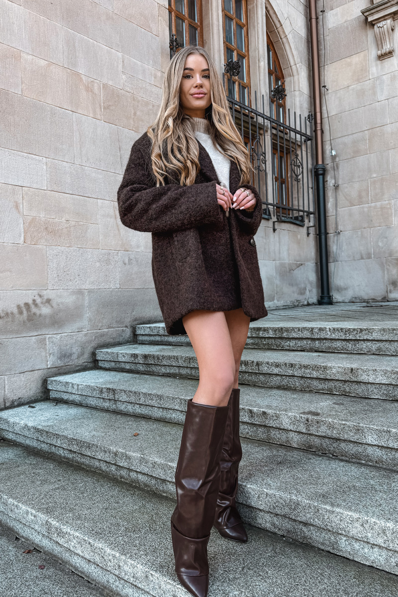 Zateplené dámske čižmy s obráteným golierom na podpätku blok čokoládové Elivira