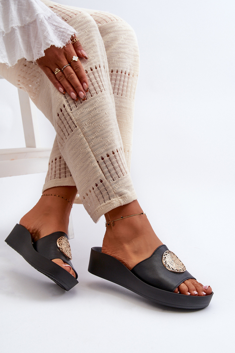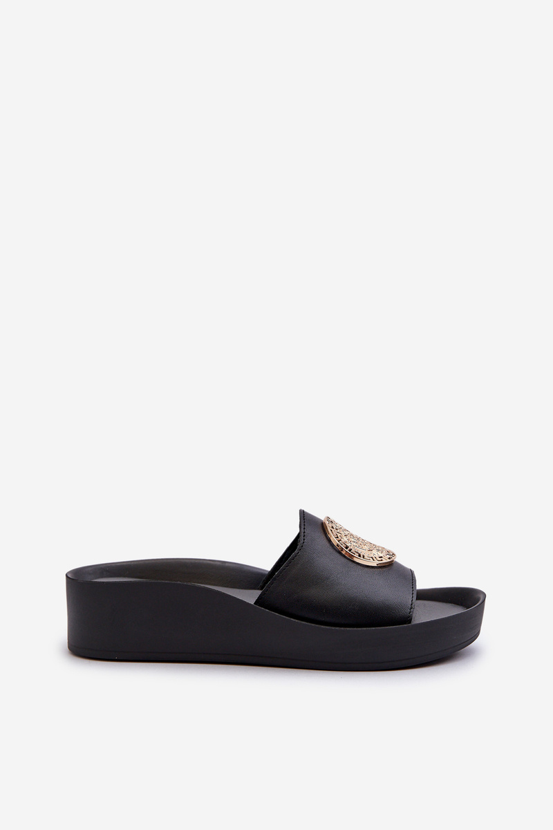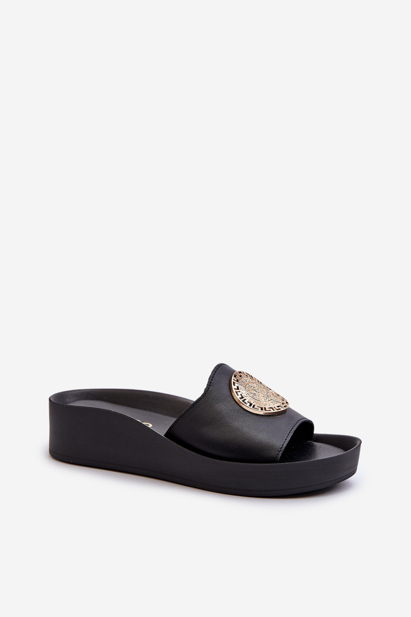 Zazoo 2920 Kožené Dámske Papuče na Klinu so Zlatým Detailom Zlatý Obrusený