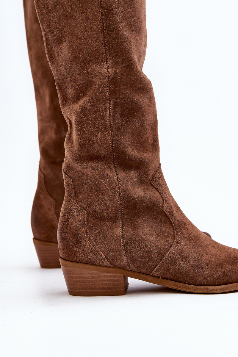 Dámske cowboy čižmy sú mimoriadne módnou obuvou na jar-jesennú sezónu. Vyrobené z prírodného zamatového materiálu. Stabilný, nízky podpätok ich robí pohodlnými a ideálnymi na nosenie každý deň. Model na zasúvanie s dodatočným zatváraním na zips uľahčuje obúvanie čižiem. Zvršok sahá tesne pod kolená. Kožená, mäkká stielka zabezpečuje pohodlie počas nosenia. Tieto čižmy skvelo doplnia rôzne štýly. Určite by mali byť súčasťou vášho šatníka! Při výběru velikosti se řiďte tabulkou velikostí.