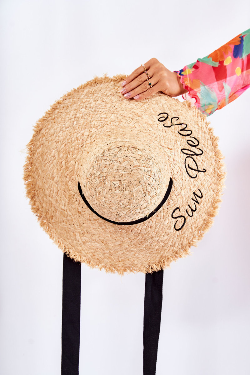 Ľahká dámska slaná klobúk ideálna na slnečné dni. Produkt je vyrobený zo 100 % slamy. Pri kruhovom objazde klobúku je viditeľný nápis. Klobúk má pásku, ktorá obklopuje polovicu kruhového objazdu, potom sa ťahá pod ním a môže byť zviazaná mnohými spôsobmi. Klobúk môžete používať počas sviatkov v horúcich dňoch. Nezabudnite skontrolovať našu kolekciu klobúkov!