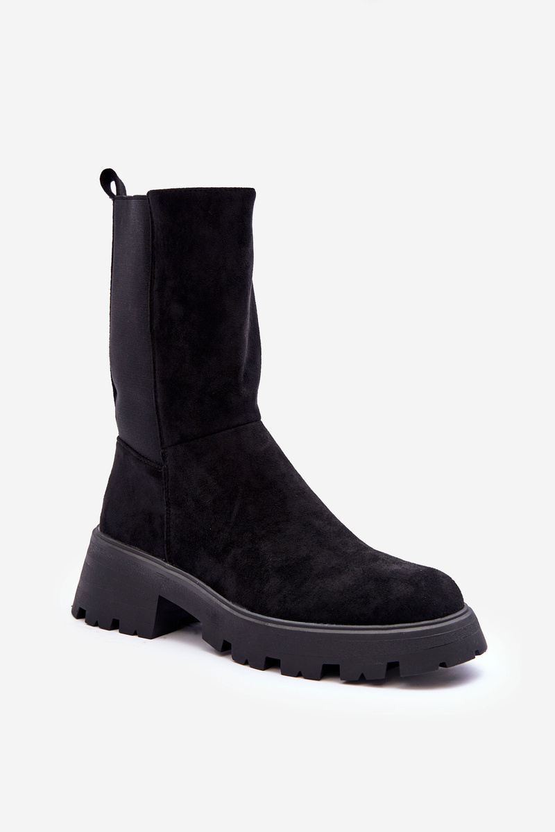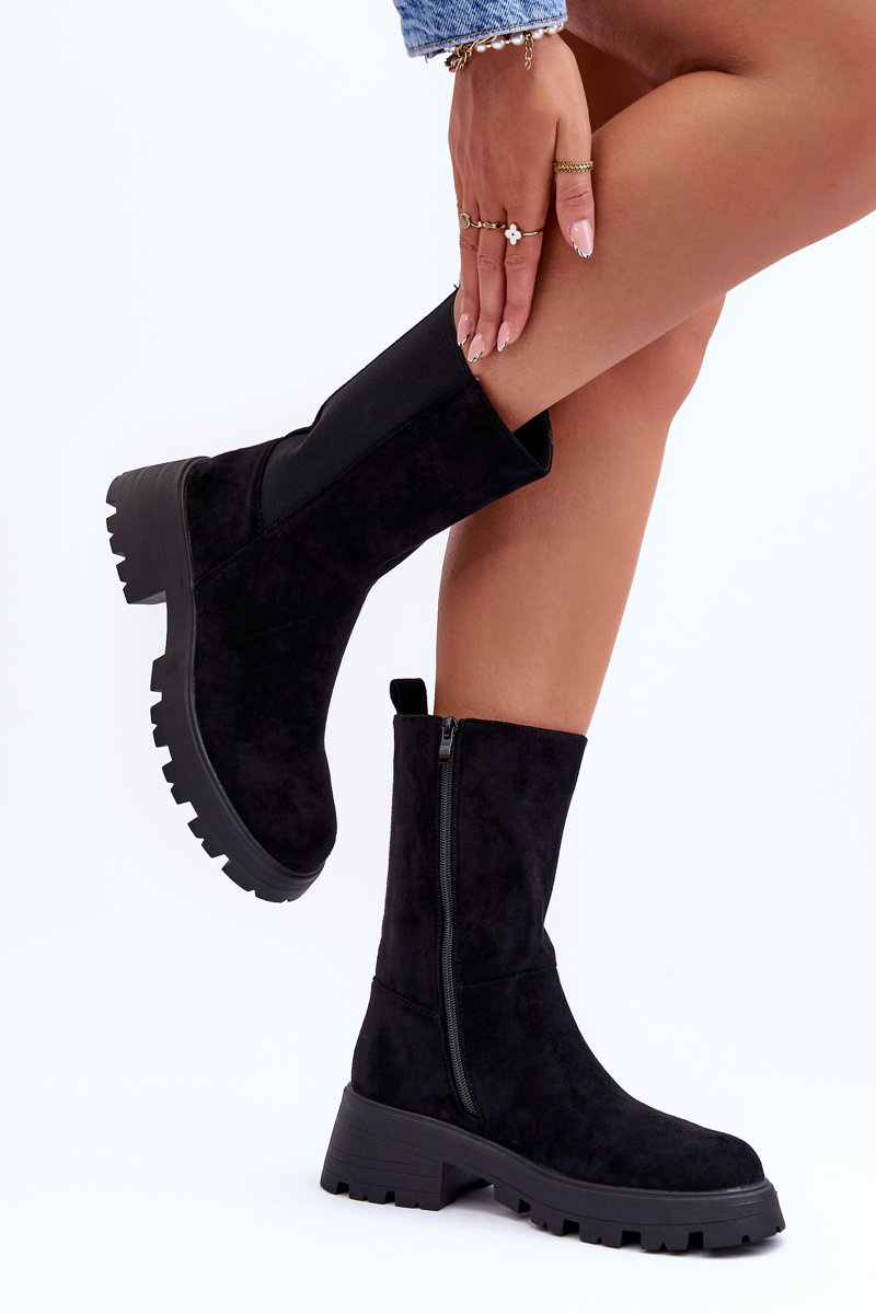 Unikátne, ženské topánky s vyšším horným z ekologického semišu. Pripevnený posúvačom na boku. Postavené na masívnej plochej päte a plošine s drážkami po bokoch. Tento model bude ideálnym doplnkom k jesenným štylizovaniu! Pri výbere veľkosti navrhnite tabuľku veľkosti. p>