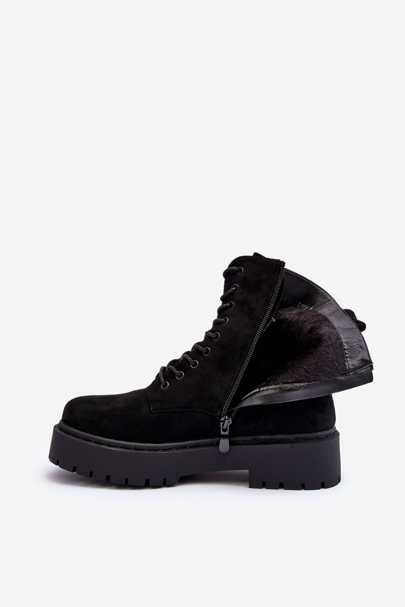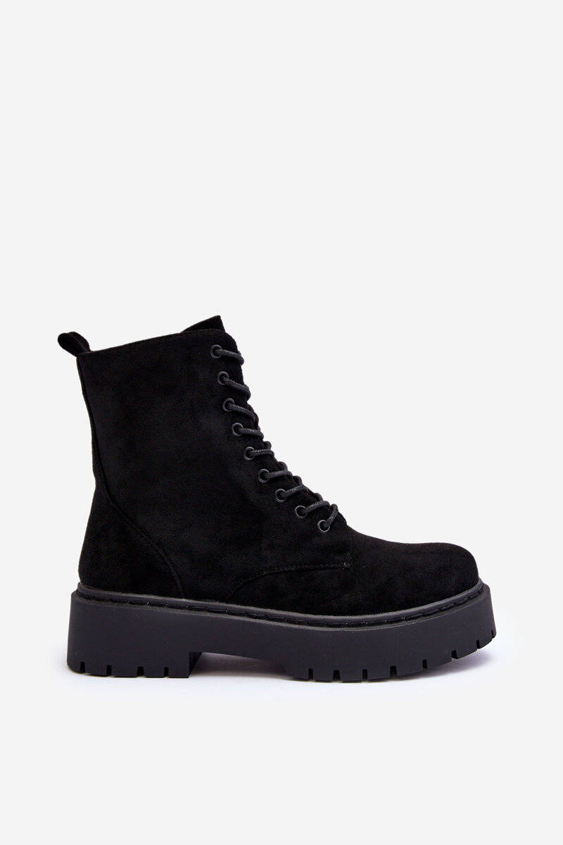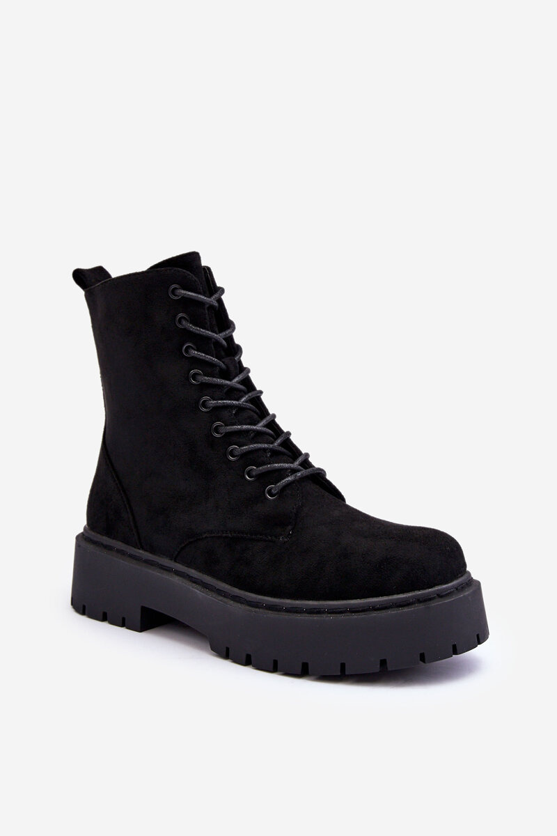 Dámske topánky s vyšším členkovým zvrškom boli vyrobené z ekologického semišu. Postavené na plošine a plochých podpätkoch. Tento model je pripevnený posúvačom a má tiež šnurovanie. Podrážka je vyrobená z gumového plastu. Interiér izolovaný prikrývkou obuvi. Studivená päta umožní primeranú stabilizáciu chodidla. Pri výbere veľkosti navrhnite tabuľku veľkosti.