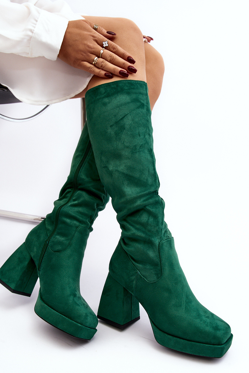 Dámske topánky s zvrškom kolena. Nastavené na masívnej platforme a podpätkoch vo forme príspevku. Tento model je pripevnený posúvačom na boku. Izolovaná vo vnútri obuvou prikrývkou. Noski na námestí. Ideálne pre šaty alebo sukne! Pri výbere veľkosti navrhnite tabuľku veľkosti. p>