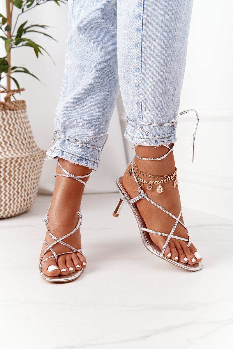 Zviazané sandále na špendlíku so striebornou dráhou štvorcového nosa